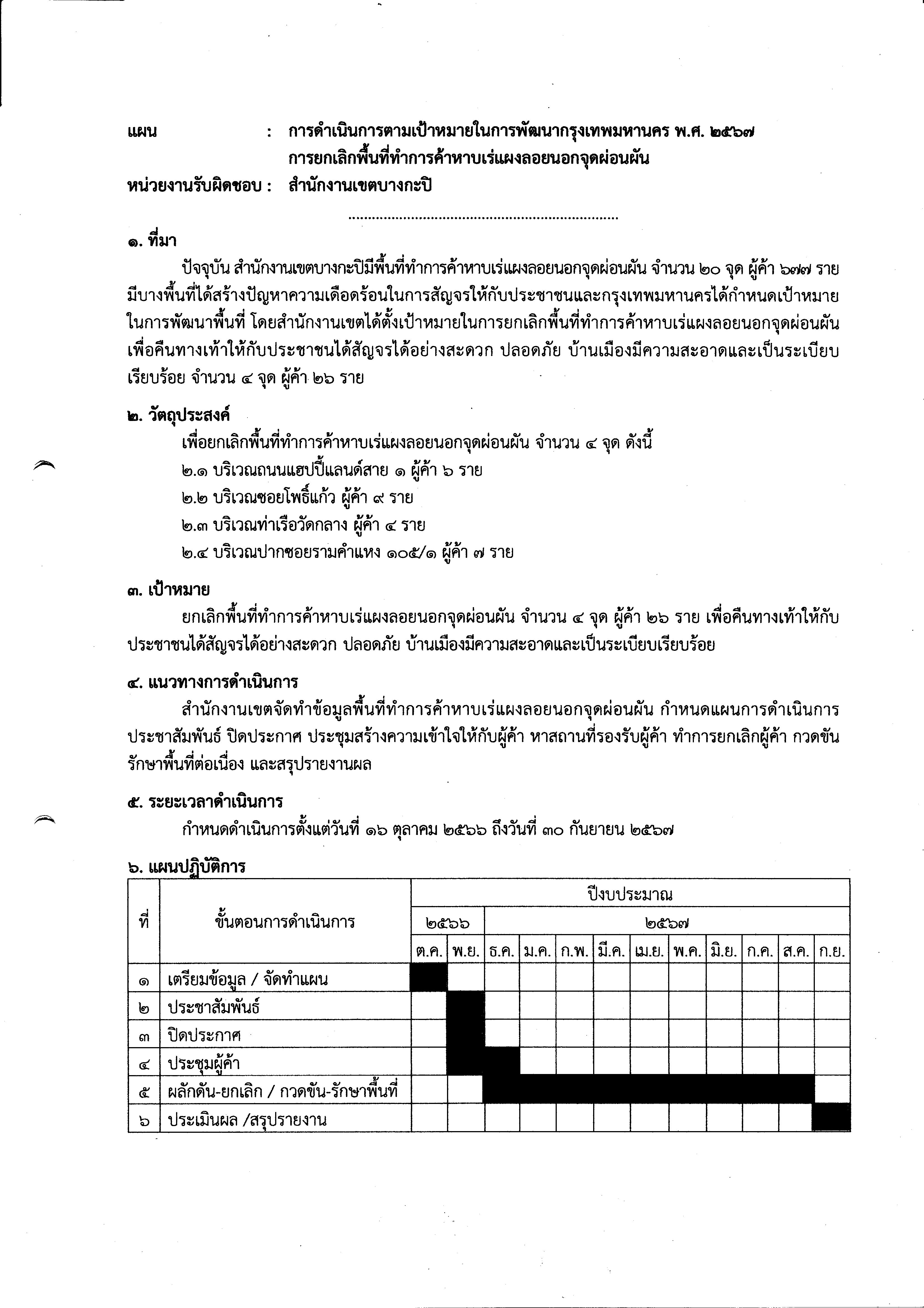 72024-06-30 00:00:00.00000000.000.00กวดขัน ติดตามผลการยกเลิก ทั้ง 4 จุด 1. ถนนแฮปปี้แลนด์ สาย 1 2. ซอยโพธิ์แก้ว 3. ท่าเรือวัดกลาง 4. ปากซอยรามคำแหง 105/1 และทั้งพื้นที่เขตบางกะปิ