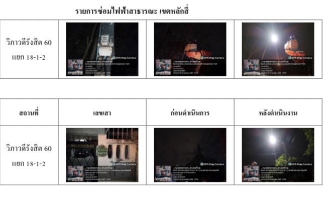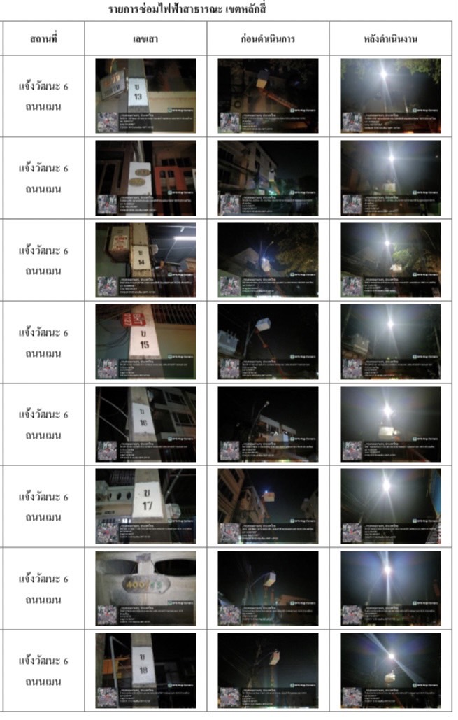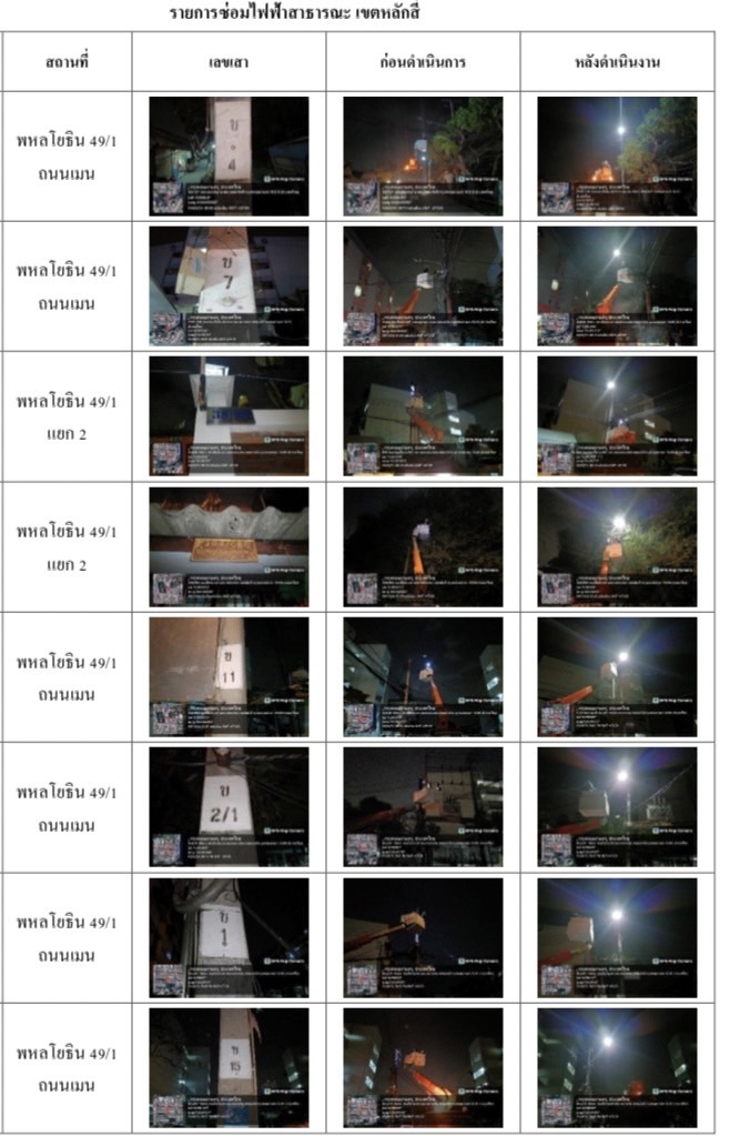| 5 | ![]() | 2024-03-19 00:00:00.0000000 | 2.00 | 0.00 | วันที่ 15 มีนาคม 2567 ดำเนินการซ่อมไฟฟ้าส่องสว่างจำนวน 2 ดวง 1.ซอยวิภาวดีรังสิต 60 แยก 18-1-2 จำนวน 1 ดวง 2.ซอยวิภาวดีรังสิต 60 แยก 18-1-2 จำนวน 1 ดวง *ติดตั้งเพิ่ม 0 ดวง | ||