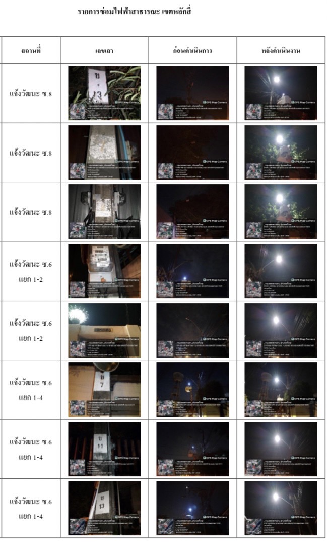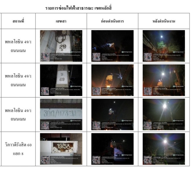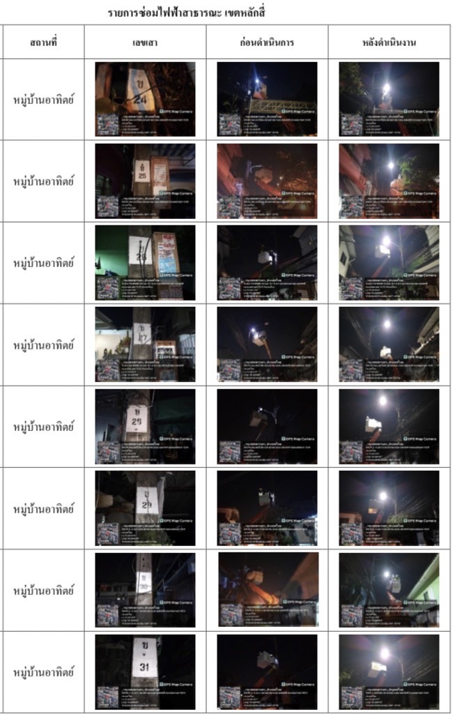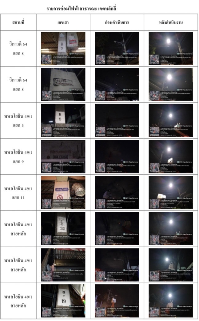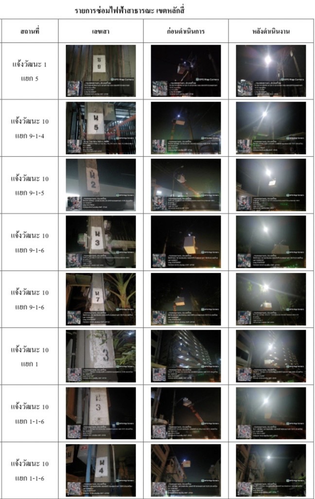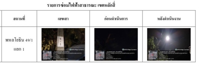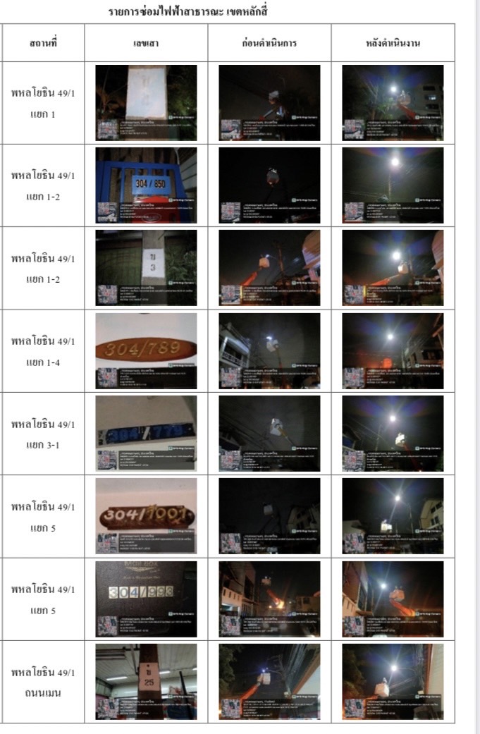 | 5 | ![]() | 2024-03-20 00:00:00.0000000 | 8.00 | 0.00 | วันที่ 19 มีนาคม 2567 ดำเนินการซ่อมไฟฟ้าส่องสว่างจำนวน 8 ดวง 1.ซอยพหลโยธิน 49/1 ถนนเมน จำนวน 1 ดวง 2.ซอยพหลโยธิน 49/1 ถนนเมน จำนวน 1 ดวง 3.ซอยพหลโยธิน 49/1 แยก2 จำนวน 1 ดวง 4.ซอยพหลโยธิน 49/1 แยก2 จำนวน 1 ดวง 5.ซอยพหลโยธิน 49/1 ถนนเมน จำนวน 1 ดวง 6.ซอยพหลโยธิน 49/1 ถนนเมน จำนวน 1 ดวง 7.ซอยพหลโยธิน 49/1 ถนนเมน จำนวน 1 ดวง 8.ซอยพหลโยธิน 49/1 ถนนเมน จำนวน 1 ดวง *ติดตั้งเพิ่ม 0 ดวง | ||