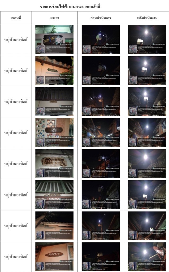 | 5 | ![]() | 2024-03-19 00:00:00.0000000 | 8.00 | 0.00 | วันที่ 17 มีนาคม 2567 ดำเนินการซ่อมไฟฟ้าส่องสว่างจำนวน 8 ดวง 1.หมู่บ้านอาทิตย์ จำนวน 1 ดวง 2.ซอยวิภาวดีรังสิต 60 แยก 3-9 จำนวน 1 ดวง 3.ซอยวิภาวดีรังสิต 60 แยก 3-9 จำนวน 1 ดวง 4.ซอยวิภาวดีรังสิต 58 แยก 2 จำนวน 1 ดวง 5.ซอยแจ้งวัฒนะ 1 แยก 5 จำนวน 1 ดวง 6.ซอยแจ้งวัฒนะ 1 แยก 5 จำนวน 1 ดวง 7.ซอยแจ้งวัฒนะ 1 แยก 5 จำนวน 1 ดวง 8.ซอยแจ้งวัฒนะ 1 แยก 5 จำนวน 1 ดวง *ติดตั้งเพิ่ม 0 ดวง | ||