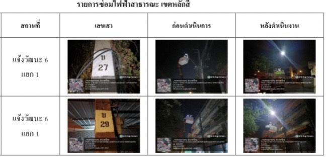 52024-03-19 00:00:00.00000002.000.00วันที่ 17 มีนาคม 2567 ดำเนินการซ่อมไฟฟ้าส่องสว่างจำนวน 2 ดวง 1.ซอยแจ้งวัฒนะ 6 แยก 1 จำนวน 1 ดวง 2.ซอยแจ้งวัฒนะ 6 แยก 1 จำนวน 1 ดวง *ติดตั้งเพิ่ม 0 ดวง