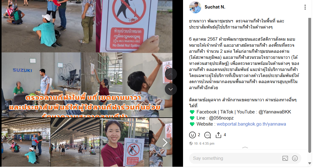 | 99 | ![]() | 2024-10-29 00:00:00.0000000 | 0.00 | 0.00 | วันที่ 6 ตุลาคม 2567 ฝ่ายพัฒนาชุมชนและสวัสดิการสังคม มอบหมายให้เจ้าหน้าที่ และอาสาสมัครลานกีฬา ลงพื้รนที่ตรวจลานกีฬา จำนวน 2 แห่ง ได้แก่ลานกีฬาชุมชนคลองด่าน (ใต้สะพานภูมิพล) และลานกีฬาสวนรวมใจชาวยานนาวา (ใต้ทางด่วนสาธุประดิษฐ์) เพื่อตรวจความพร้อมในด้านต่างๆ ของลานกีฬา ตลอดจนประชาสัมพันธ์ แนะนำผู้ใช้บริการลานกีฬา โดยเฉพาะผู้ใช้บริการที่เป็นชาวต่างด้าวโดยประชาสัมพันธ์ให้งดการบ้วนน้ำหมากลงบนพื้นลานกีฬา ตลอดจนารสูบบุหรี่ในลานกีฬาอีกด้วย | ||