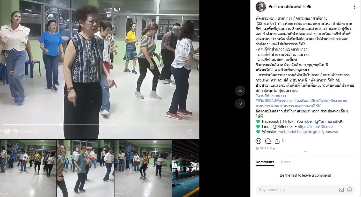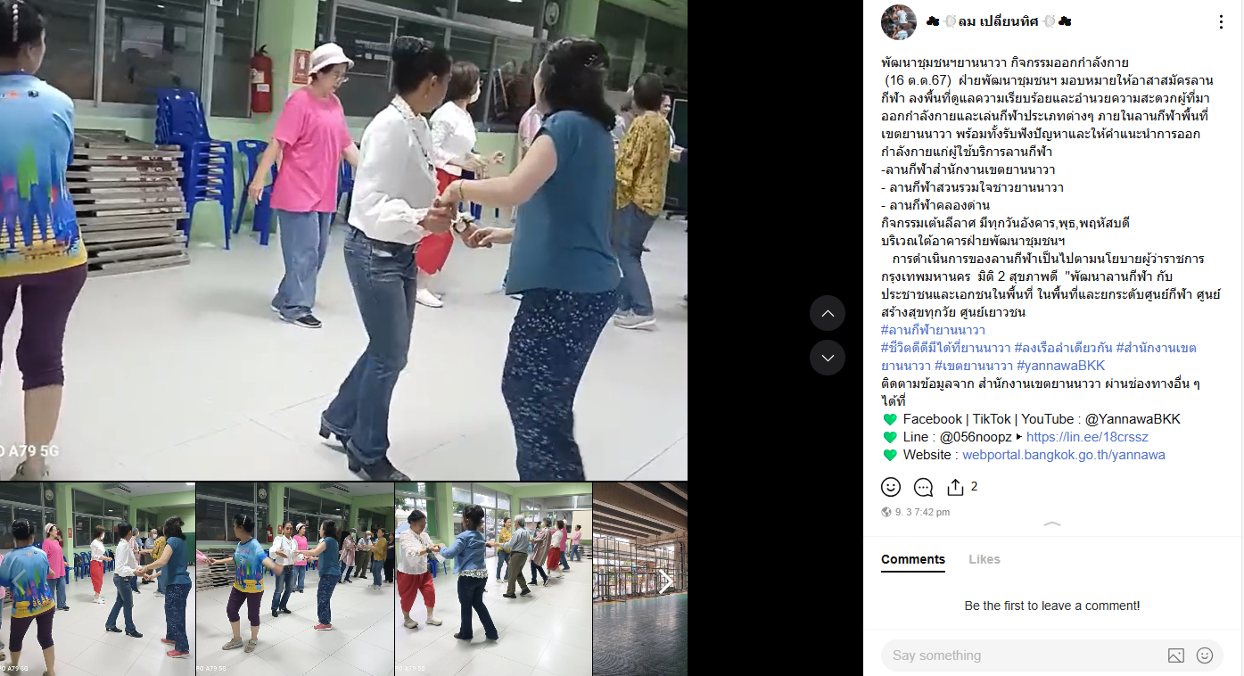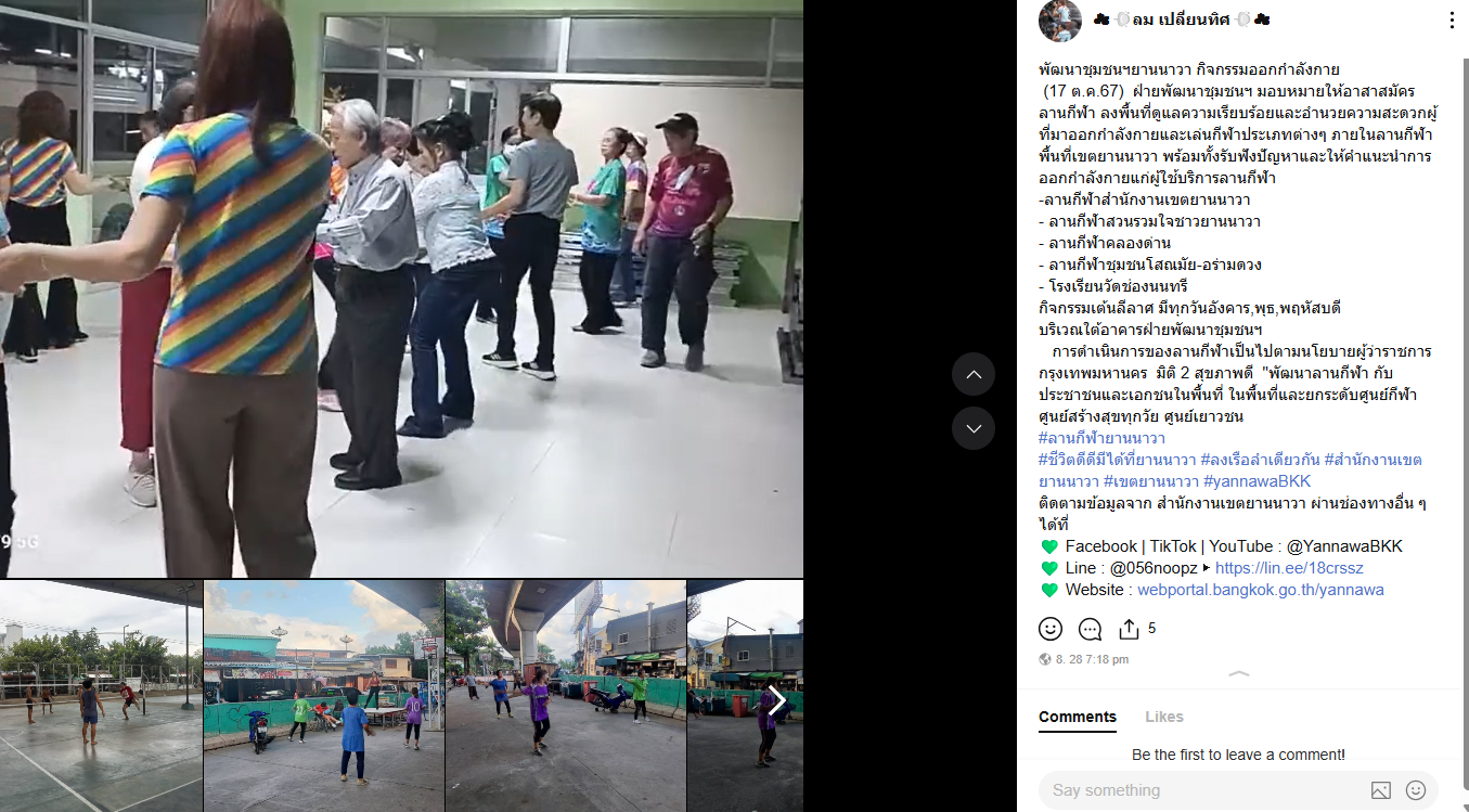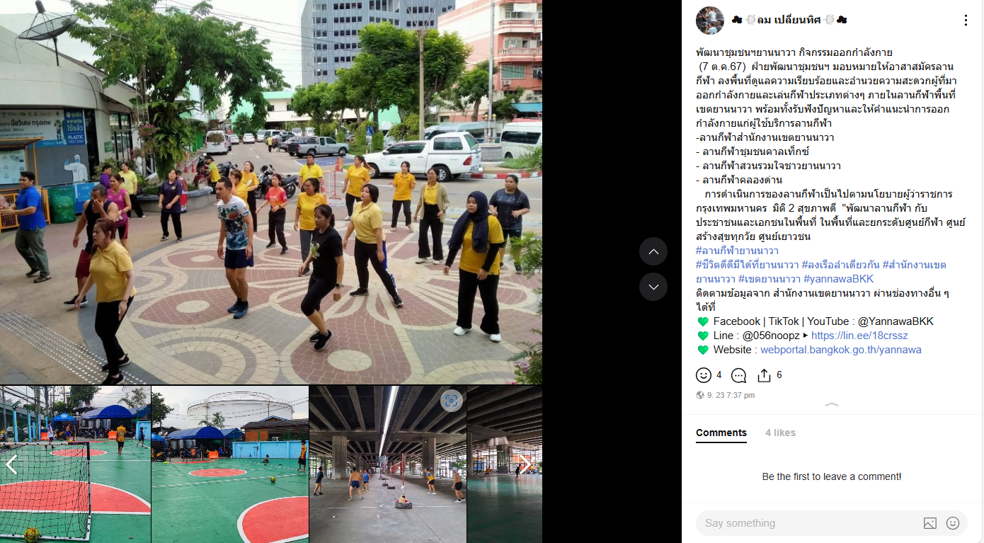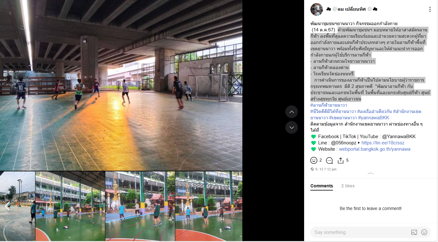 | 99 | ![]() | 2024-10-29 00:00:00.0000000 | 0.00 | 0.00 | วันที่ 1 ตุลาคม 2567 ฝ่ายพัฒนาชุมชนฯ มอบหมายให้อาสาสมัครลานกีฬา ลงพื้นที่ดูแลความเรียบร้อยและอำนวยความสะดวกผู้ที่มาออกกำลังกายและเล่นกีฬาประเภทต่างๆ ภายในลานกีฬาพื้นที่เขตยานนาวา พร้อมทั้งรับฟังปัญหาและให้คำแนะนำการออกกำลังกายแก่ผู้ใช้บริการลานกีฬา -ลานกีฬาสำนักงานเขตยานนาวา - ลานกีฬาสวนรวมใจชาวยานนาวา - ลานกีฬาคลองด่าน - ลานกีฬาชุมชนคาลเท็กซ์ - ชมรมแม่บ้านยานนาวา กิจกรรมเต้นลีลาศ มีทุกวันอังคาร,พุธ,พฤหัสบดี บริเวณใต้อาคารฝ่ายพัฒนาชุมชนฯ การดำเนินการของลานกีฬาเป็นไปตามนโยบายผู้ว่าราชการกรุงเทพมหานคร มิติ 2 สุขภาพดี "พัฒนาลานกีฬา กับประชาชนและเอกชนในพื้นที่ ในพื้นที่และยกระดับศูนย์กีฬา ศูนย์สร้างสุขทุกวัย ศูนย์เยาวชน | ||