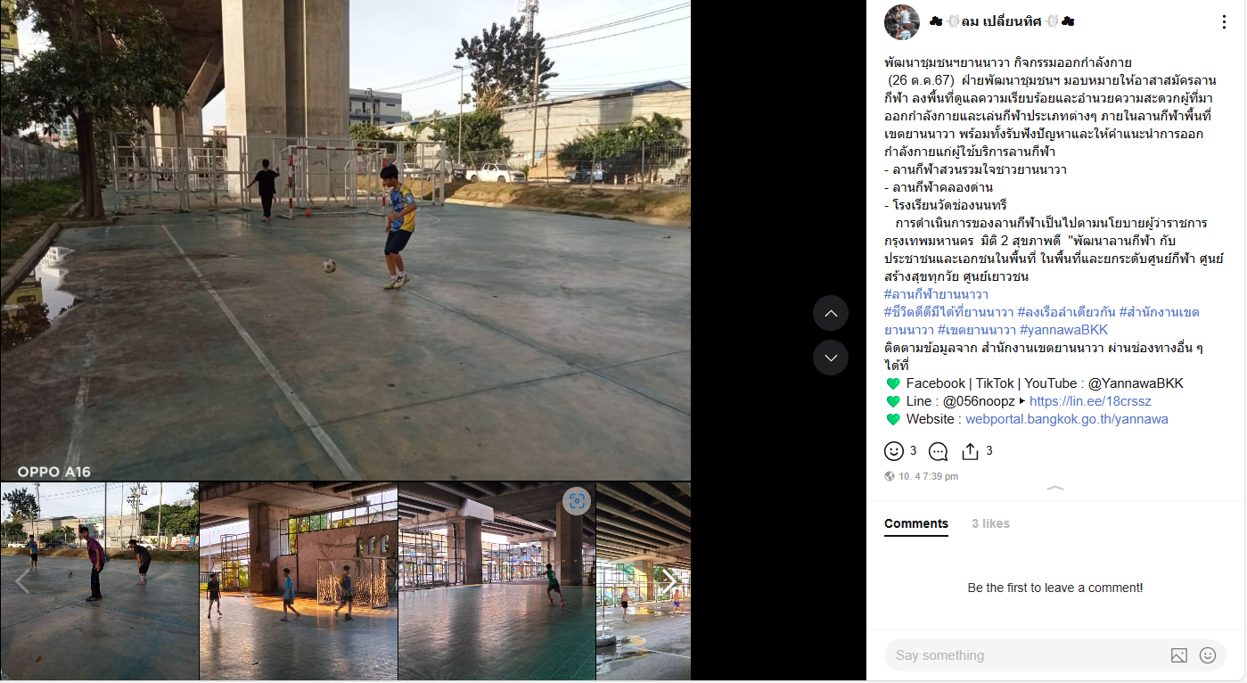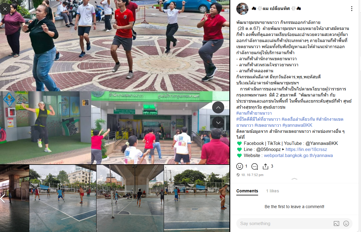 | 99 | ![]() | 2024-11-05 00:00:00.0000000 | 0.00 | 0.00 | วันที่ 1 พฤศจิกายน 2567 ฝ่ายพัฒนาชุมชนฯ มอบหมายให้อาสาสมัครลานกีฬา ลงพื้นที่ดูแลความเรียบร้อยและอำนวยความสะดวกผู้ที่มาออกกำลังกายและเล่นกีฬาประเภทต่างๆ ภายในลานกีฬาพื้นที่เขตยานนาวา พร้อมทั้งรับฟังปัญหาและให้คำแนะนำการออกกำลังกายแก่ผู้ใช้บริการลานกีฬา - ลานกีฬาสวนรวมใจชาวยานนาวา - ลานกีฬาชุมชนคาลเท็กซ์ - ลานกีฬาชุมชนคลองด่าน - โรงเรียนวัดช่องนนทรี การดำเนินการของลานกีฬาเป็นไปตามนโยบายผู้ว่าราชการกรุงเทพมหานคร มิติ 2 สุขภาพดี "พัฒนาลานกีฬา กับประชาชนและเอกชนในพื้นที่ ในพื้นที่และยกระดับศูนย์กีฬา ศูนย์สร้างสุขทุกวัย ศูนย์เยาวชน | ||