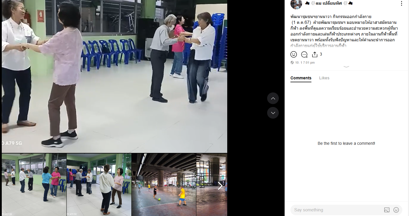 | 99 | ![]() | 2024-11-05 00:00:00.0000000 | 0.00 | 0.00 | วันที่ 31 ตุลาคม 2567 ฝ่ายพัฒนาชุมชนฯ มอบหมายให้อาสาสมัครลานกีฬา ลงพื้นที่ดูแลความเรียบร้อยและอำนวยความสะดวกผู้ที่มาออกกำลังกายและเล่นกีฬาประเภทต่างๆ ภายในลานกีฬาพื้นที่เขตยานนาวา พร้อมทั้งรับฟังปัญหาและให้คำแนะนำการออกกำลังกายแก่ผู้ใช้บริการลานกีฬา - ลานกีฬาสวนรวมใจชาวยานนาวา - ลานกีฬาชุมชนคาลเท็กซ์ - ลานกีฬาชุมชนคลองด่าน กิจกรรมเต้นลีลาศ มีทุกวันอังคาร,พุธ,พฤหัสบดี บริเวณใต้อาคารฝ่ายพัฒนาชุมชนฯ การดำเนินการของลานกีฬาเป็นไปตามนโยบายผู้ว่าราชการกรุงเทพมหานคร มิติ 2 สุขภาพดี "พัฒนาลานกีฬา กับประชาชนและเอกชนในพื้นที่ ในพื้นที่และยกระดับศูนย์กีฬา ศูนย์สร้างสุขทุกวัย ศูนย์เยาวชน | ||