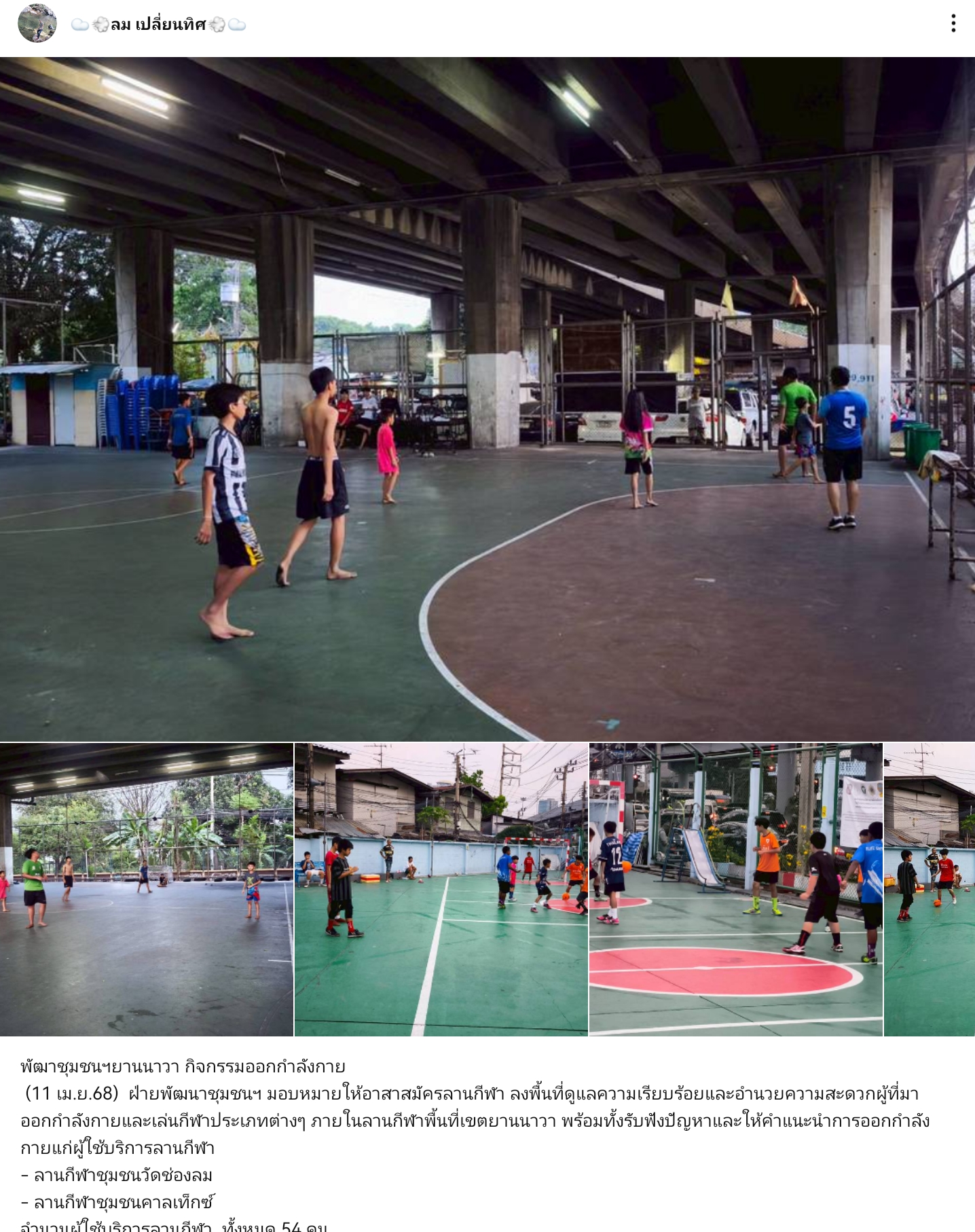 | 99 | ![]() | 2025-04-12 00:00:00.0000000 | 0.00 | 0.00 | พัฒาชุมชนฯยานนาวา กิจกรรมออกกำลังกาย (11 เม.ย.68) ฝ่ายพัฒนาชุมชนฯ มอบหมายให้อาสาสมัครลานกีฬา ลงพื้นที่ดูแลความเรียบร้อยและอำนวยความสะดวกผู้ที่มาออกกำลังกายและเล่นกีฬาประเภทต่างๆ ภายในลานกีฬาพื้นที่เขตยานนาวา พร้อมทั้งรับฟังปัญหาและให้คำแนะนำการออกกำลังกายแก่ผู้ใช้บริการลานกีฬา - ลานกีฬาชุมชนวัดช่องลม - ลานกีฬาชุมชนคาลเท็กซ์ จำนวนผู้ใช้บริการลานกีฬา ทั้งหมด 54 คน กิจกรรมเต้นลีลาศ มีทุกวันอังคาร,พุธ,พฤหัสบดี บริเวณใต้อาคารฝ่ายพัฒนาชุมชนฯ การดำเนินการของลานกีฬาเป็นไปตามนโยบายผู้ว่าราชการกรุงเทพมหานคร มิติ 2 สุขภาพดี "พัฒนาลานกีฬา กับประชาชนและเอกชนในพื้นที่ ในพื้นที่และยกระดับศูนย์กีฬา ศูนย์สร้างสุขทุกวัย ศูนย์เยาวชน | ||