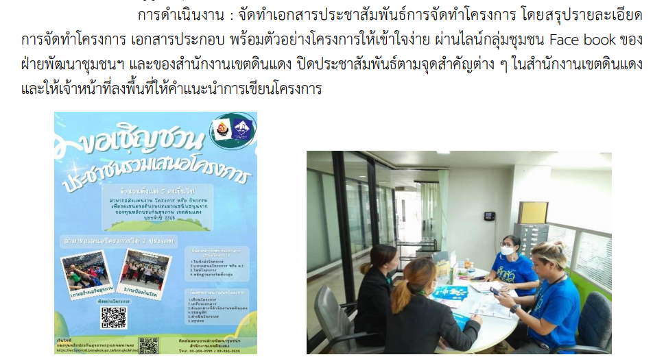 | 20 | ![]() | 2024-09-30 00:00:00.0000000 | 0.00 | 0.00 | จัดทำเอกสารประชาสัมพันธ์การจัดทำโครงการ โดยสรุปรายละเอียดการจัดทำโครงการ เอกสารประกอบ พร้อมตัวอย่างโครงการให้เข้าใจง่าย ผ่านไลน์กลุ่มชุมชน Facebook ของฝ่ายพัฒนาชุมชนฯ และของสำนักงานเขตดินแดง ปิดประชาสัมพันธ์ตามจุดต่าง ๆ ในสำนักงานเขตดินแดง และให้เจ้าหน้าที่ลงพื้นที่ให้คำแนะนำการเขียนโครงการ | ||