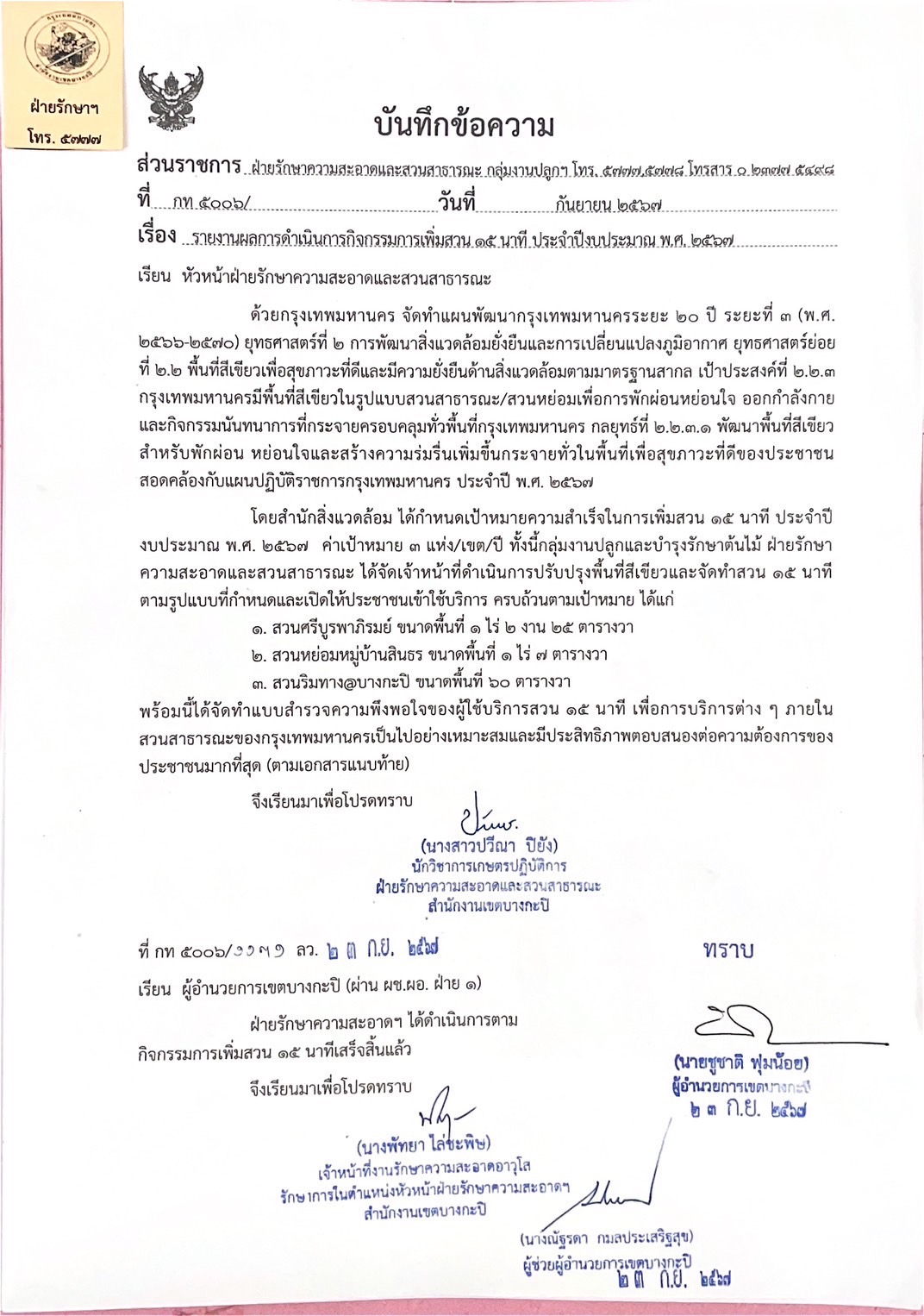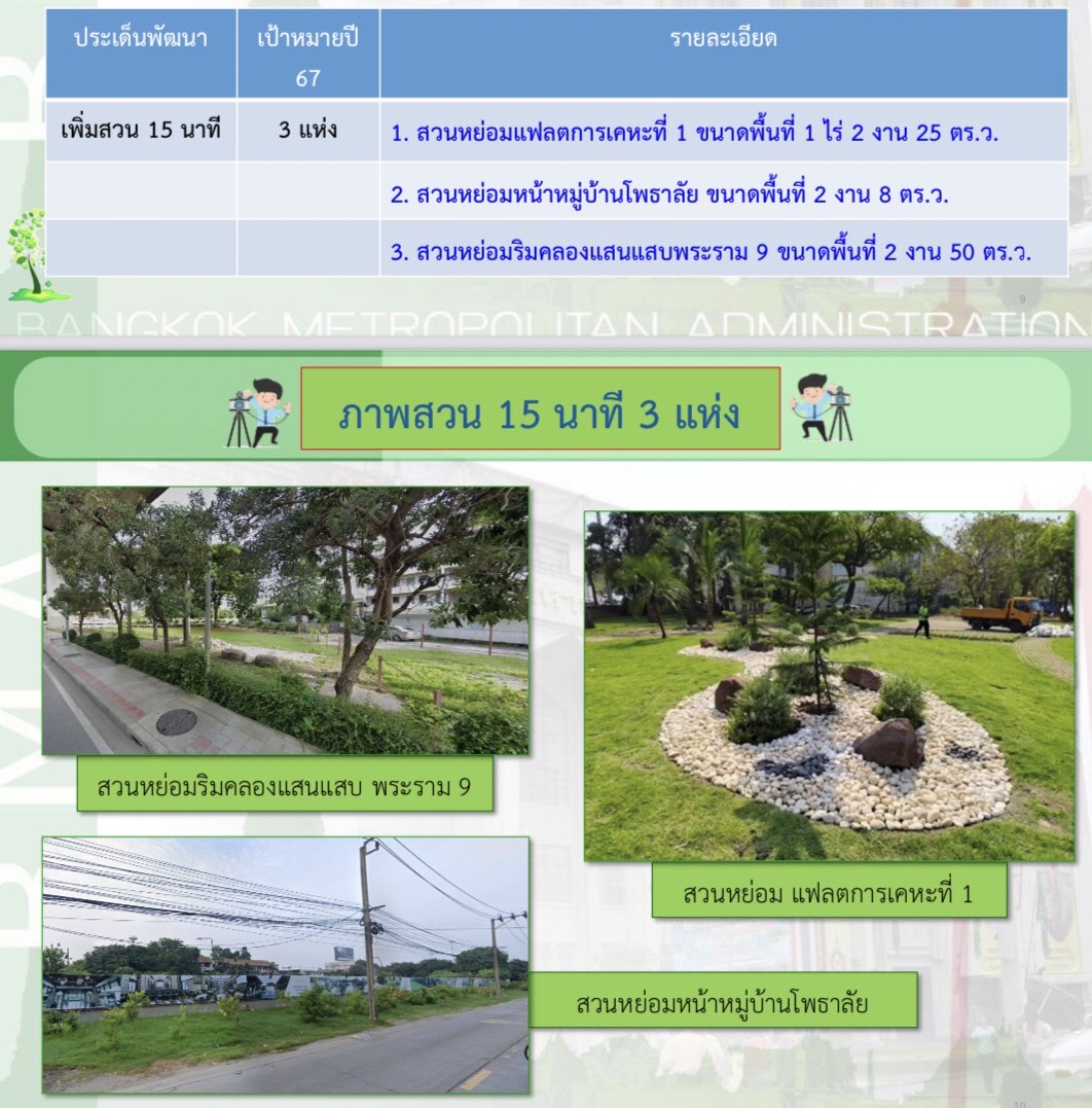 ![]() | 6 | ดำเนินการก่อสร้าง/ปรับปรุง/พัฒนาพื้นที่สีเขียวให้เป็นสวน 15 นาที แห่งที่ 3 | 15.00 | 2024-05-01 00:00:00.0000000 | 2024-07-31 00:00:00.0000000 |