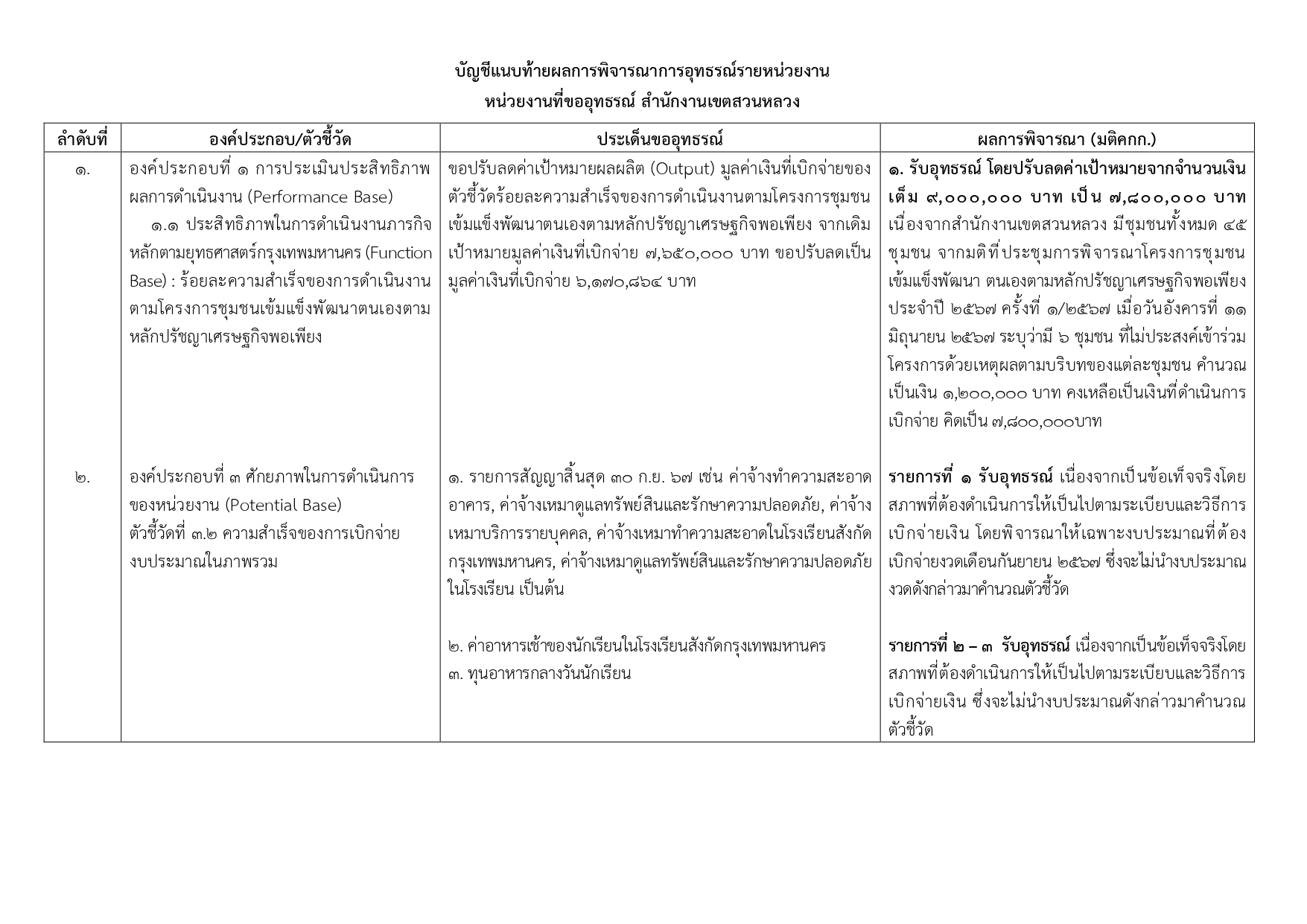มติคคก. รับอุทธรณ์ โดยปรับลดค่าเป้าหมายจากจํานวนเงินเต็ม 9,000,000 บาท เป็น 7,800,000 บาท เนื่องจากสํานักงานเขตสวนหลวง มีชุมชนทั้งหมด 45 ชุมชน จากมติที่ประชุมการพิจารณาโครงการชุมชนเข้มแข็งพัฒนาตนเองตามหลักปรัชญาเศรษฐกิจพอเพียง ประจําปี 2567 ครั้งที่ 1/2567 เมื่อวันอังคารที่ 11 มิถุนายน 2567 ระบุว่ามี 6 ชุมชน ที่ไม่ประสงค์เข้าร่วมโครงการด้วยเหตุผลตามบริบทของแต่ละชุมชน คํานวณเป็นเงิน 1,200,000 บาท คงเหลือเป็นเงินที่ดําเนินการเบิกจ่ายคิดเป็น 7,800,000 บาท