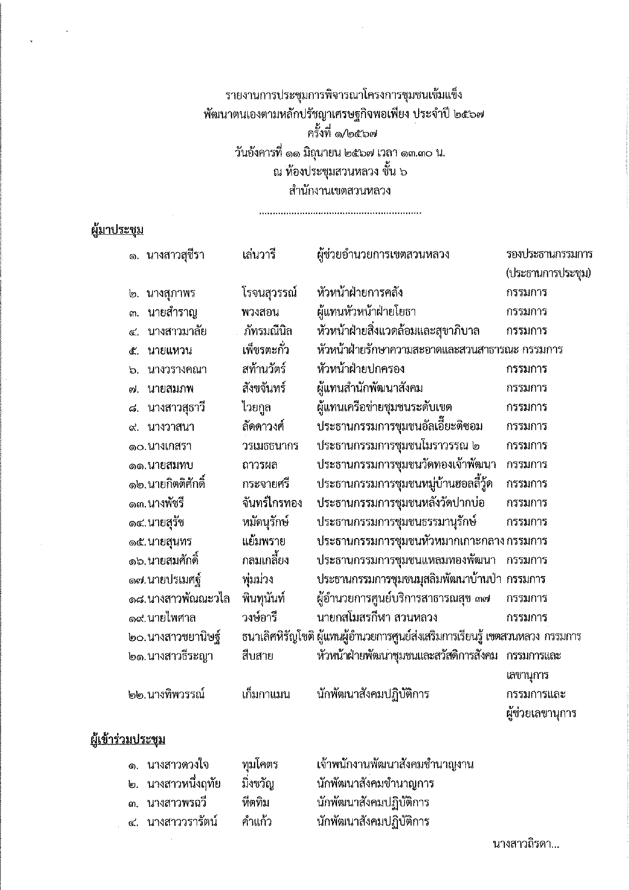| 19 |  | 2024-08-09 00:00:00.0000000 | 0.00 | 0.00 |  | 11 กรกฎาคม 2567 ประชุมพิจารณา โครงการชุมชนเข้มแข็งพัฒนาตนเอง ตามหลักปรัชญาเศรษฐกิจพอเพียง ประจำปี 2567 ครั้งที่ 2/2567 เพื่อพิจารณาชุมชนที่มีการเปลี่ยนแปลงโครงการ จำนวน 9 ชุมชน 10 โครงการ ซึ่งในที่ประชุมไม่ได้มีการแก้ไข และให้ผ่านทั้ง 10 โครงการ