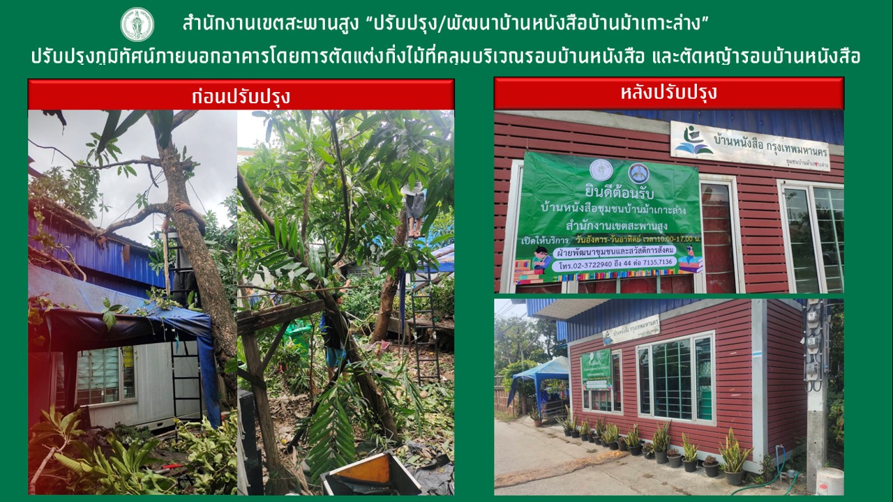 - ปรับปรุงภูมิทัศน์ภายนอกอาคาร โดยการตัดแต่งกิ่งไม้ที่คลุมบริเวณรอบบ้านหนังสือ และตัดหญ้ารอบบ้านหนังสือ