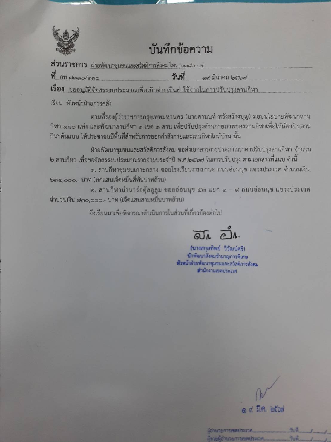 | 13 | ![]() | 2024-04-24 00:00:00.0000000 | 0.00 | 0.00 | ดำเนินการขออนุมัติจัดสรรงบประมาณจากสำนักงบประมาณเพื่อเบิกจ่ายเป็นค่าใช้จ่ายในการปรับปรุงลานกีฬา จำนวน 2 ลานคือ 1.ลานกีฬาชุมชนเกาะกลางซอยโรงเรียนงามมานะ ถ.อ่อนนุชแขวงประเวศ จำนวนเงิน 674,000.-บาท 2.ลานกีฬาม่านาร่อตุ้ลอูลูม ซอยอ่อนนุช 53 แยก 1-9 ถนนอ่อนนุช แขวงประเวศ เป็นเงิน 730,000.-บาท | ||