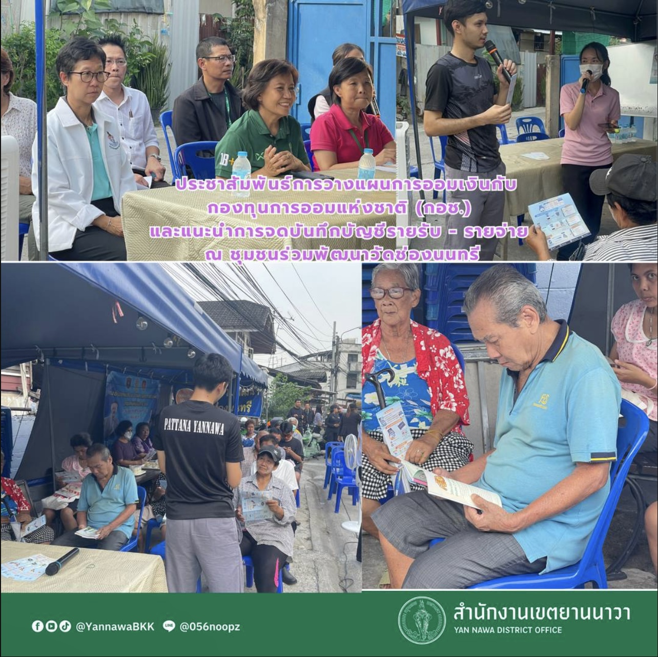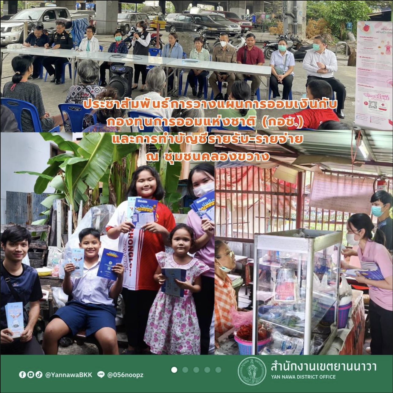 -ประชาสัมพันธ์กองทุนการออมแห่งชาติ (กอช.) ขั้นตอนการวางแผนการออมเงิน ส่งเสริมวินัยทางการออม ผ่านแอป กอช. แก่ประชาชนทั่วไป พ่อค้าแม่ค้า และผู้ประกอบอาชีพต่างๆ ณ บริเวณพื้นที่เขตยานาวา | |