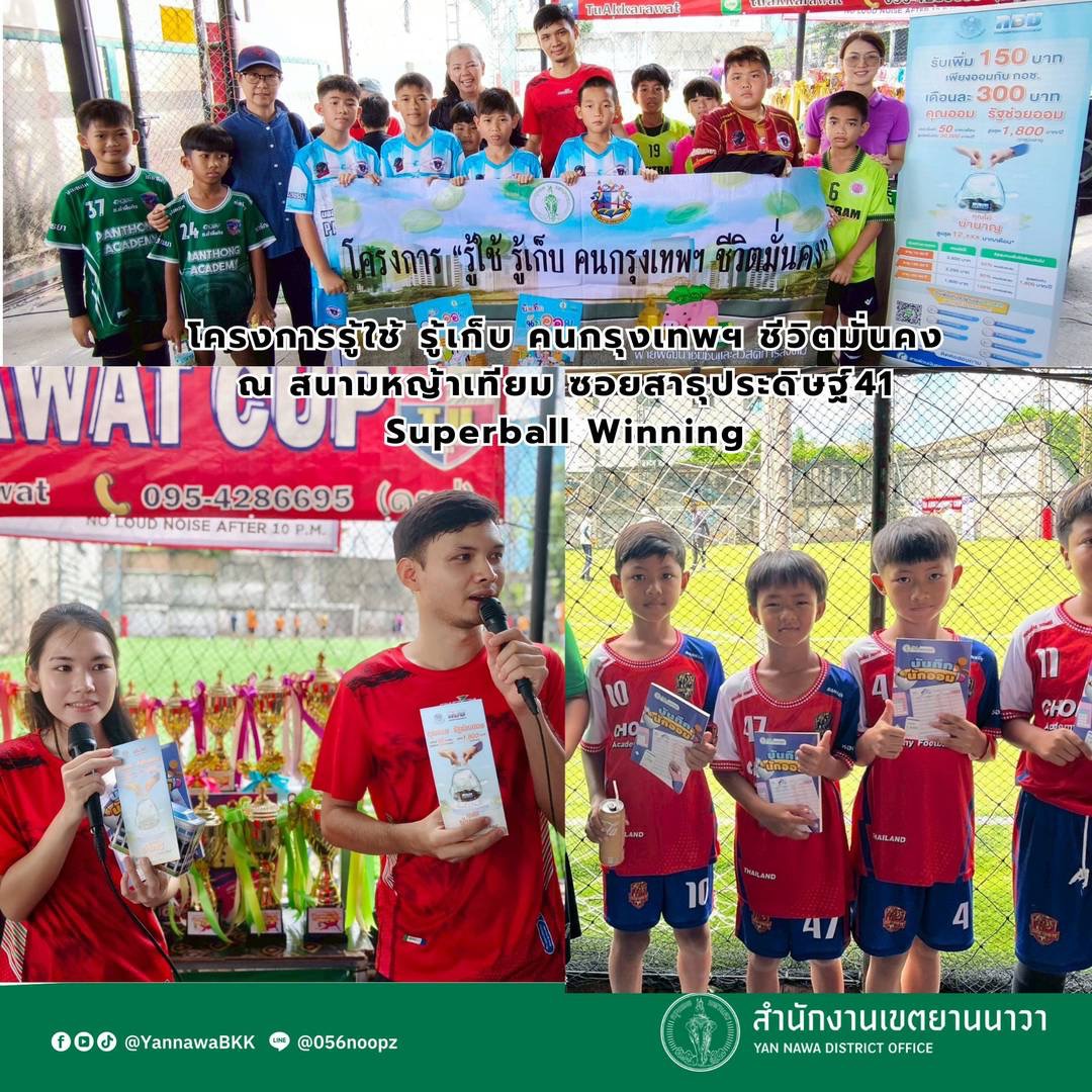 | 99 | ![]() | 2025-06-11 00:00:00.0000000 | 0.00 | 0.00 | วันที่ 8 มิถุนายน 2568 ฝ่ายพัฒนาชุมชนฯ นำทีมเจ้าหน้าที่จัดกิจกรรมให้ความรู้กับน้องๆนักกีฬาที่ร่วมแข่งฟุตบอล ณ สนามหญ้าเทียมซอยสาธุประดิษฐ์41 Superball Winningโดยฝ่ายพัฒนาชุมชนและสวัสดิการสังคม จัดกิจกรรมโครงการรู้ใช้รู้เก็บ คนกรุงเทพฯ ชีวิตมั่นคง ออกหน่วยรณรงค์เคลื่อนที่ส่งเสริมการบริหารเงินออม ให้ความรู้ด้านการบริหารเงินออม การทำบัญชีรายรับ รายจ่ายและประชาสัมพันธ์กองทุนการออมแห่งชาติ(กอช.)ให้กับน้องๆและผู้ปกครองเพื่อการบริหารใช้จ่ายเงินที่ดี ให้ครอบครัวมีเงินเก็บสำรองไว้ใช้ในยามฉุกเฉิน สร้างวินัยการออมให้กับตนเอง | ||