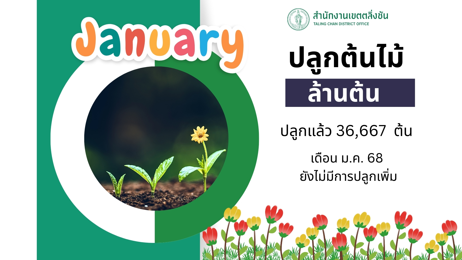 ![]() | - | ปลูกต้นไม้ล้านต้น (ต้นไม้ทั้งหมด) | 0.00 | 100.00 | สำนักงานเขตตลิ่งชัน | ฝ่ายรักษาความสะอาดและสวนสาธารณะ |