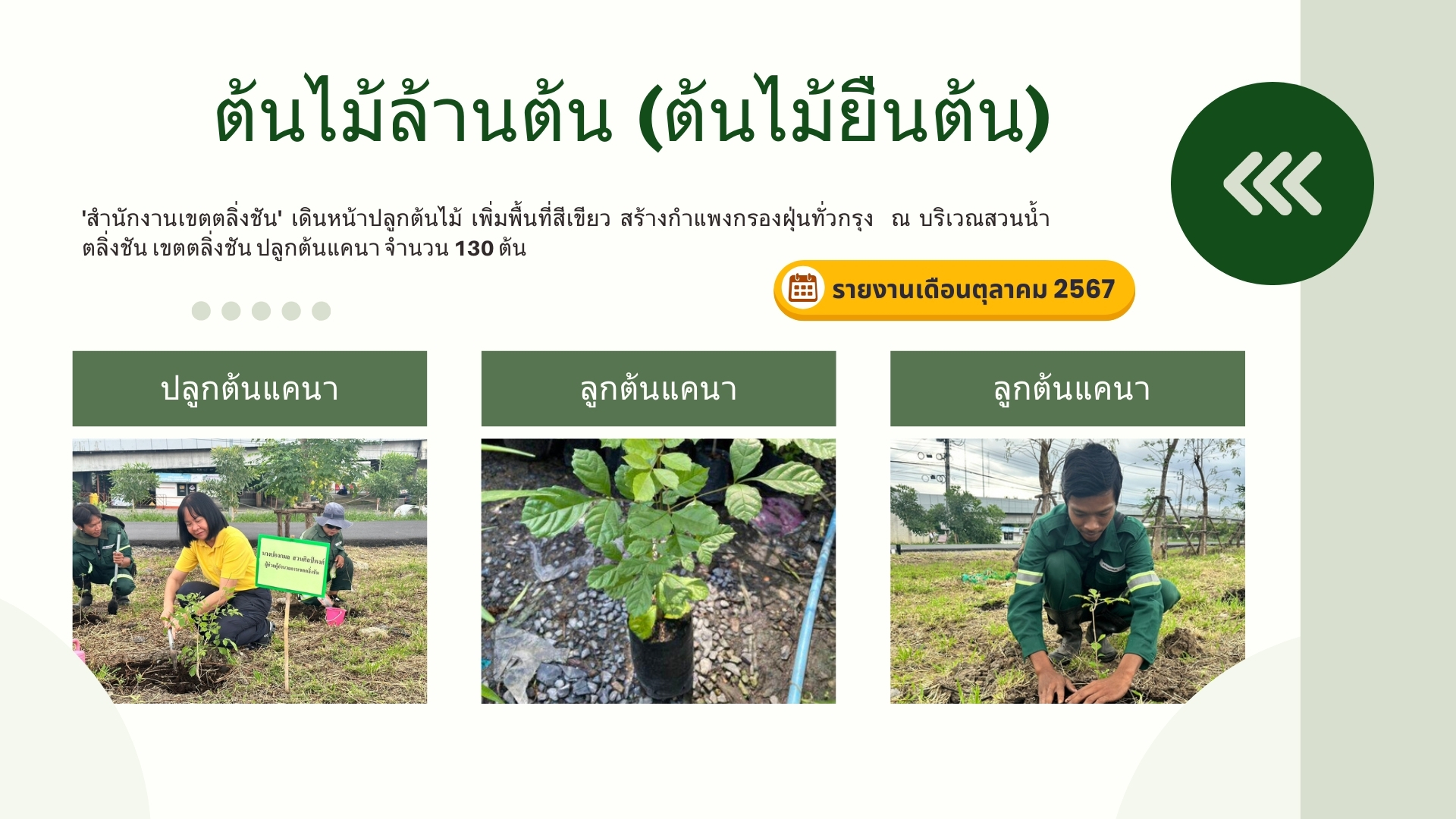 | 5152 | ![]() | 2024-09-25 00:00:00.0000000 | 8,325.00 | 0.00 | สำนักงานเขตตลิ่งชันดำเนินการปลูกต้นไม้ประจำเดือนกันยายน จำนวน 8,325 ต้น |