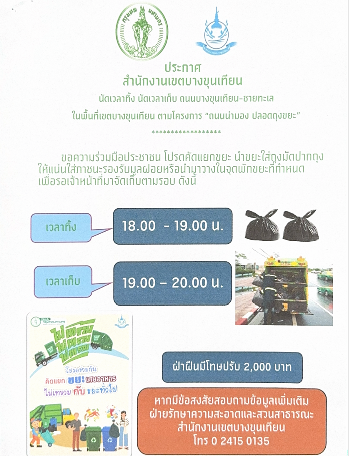 | 5211 | ![]() | 2025-05-27 00:00:00.0000000 | 0.00 | 0.00 | เดือนพฤษภาคม 2568 สำนักงานเขตบางขุนเทียน ดำเนินการกำหนดจุด นัดเวลาทิ้ง นัดเวลาเก็บ ถนนบางขุนเทียน-ชายทะเล โดยจัดทำประกาศและแจ้งประชาชนที่พักอาศัยอยู่ในบริเวณถนนบางขุนเทียน-ชายทะเล ให้ทราบช่วงเวลาที่จัดเก็บตามรอบ ดังนี้ เวลาทิ้ง 18.00 - 19.00 น. เวลาเก็บ 19.00 - 20.00 น. | ||