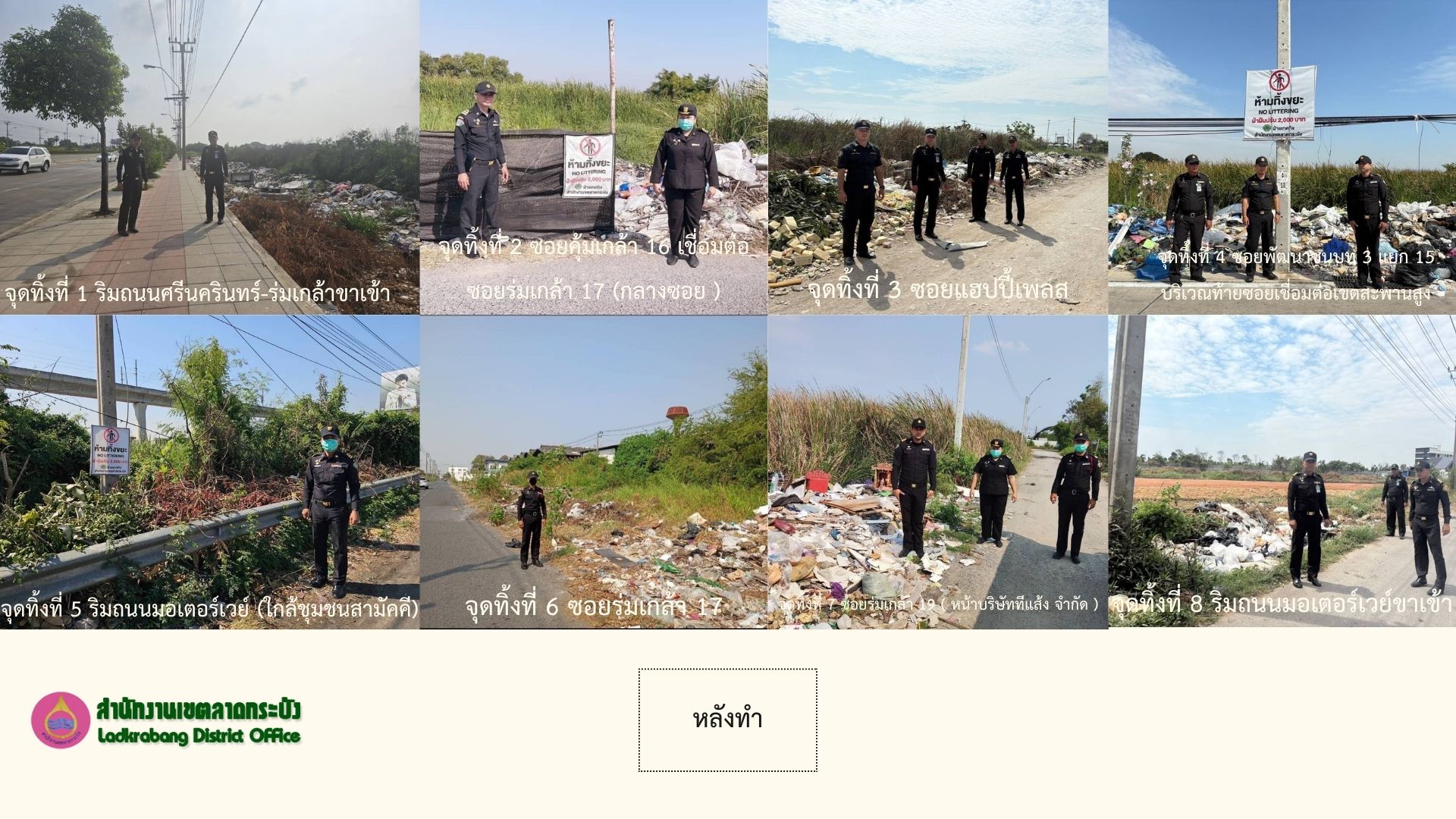 50672025-08-25 00:00:00.00000000.000.00ฝ่ายเทศกิจ สำนักงานเขตลาดกระบัง ดำเนินการตรวจจุดลักลอบทิ้งขยะ ทั้งหมด 8 จุด ประจำเดือนสิงหาคม 2568 - เป็นไปด้วยความเป็นระเบียบเรียบร้อย