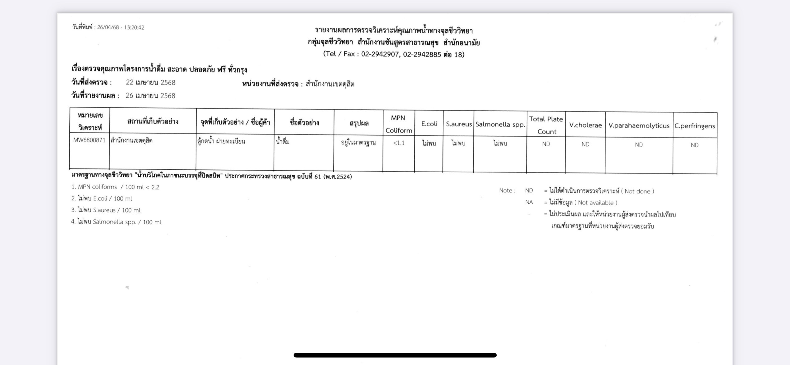| 5409 | ![]() | 2025-05-24 00:00:00.0000000 | 0.00 | 0.00 | ผลการตรวจวิเคราะห์คุณภาพน้ำทางจุลชีววิทยา ผลปรากฎว่า อยู่ในมาตรฐานทางจุลชีววิทยา น้ำบริโภคในภาชนะบรรจุปิดสนิท ตามประกาศกระทรวงสาธารณสุขฉบับที่ 61 (พ.ศ. 2524) | ||