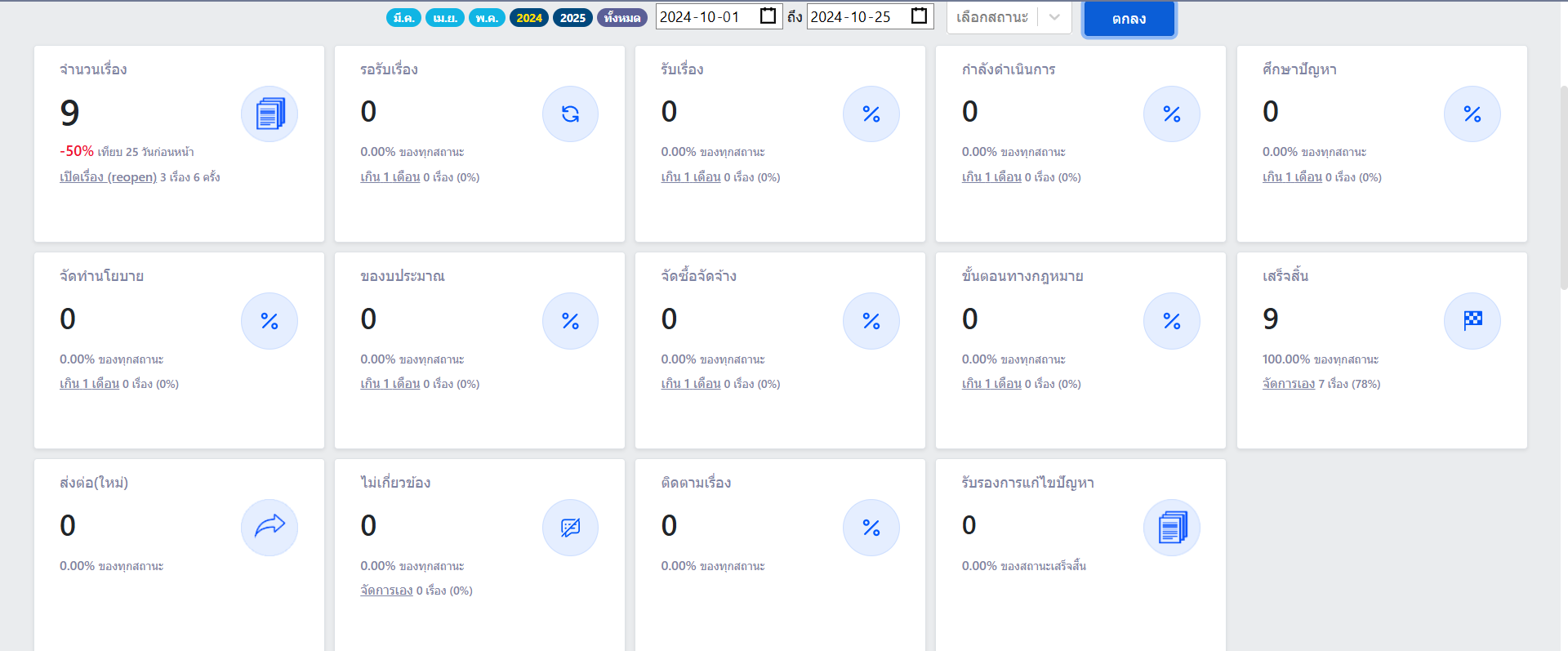 | 5130 | ![]() | 2025-06-23 00:00:00.0000000 | 0.00 | 0.00 | รายงานของวันที่ 1 ตุลาคม 2567 - 23 มิถุนายน 2568 มีเรื่องร้องเรียนทั้งหมด จำนวน 99 เรื่อง ดำเนินการเสร็จสิ้น จำนวน 93 เรื่อง จัดการเอง 72 เรื่อง (77%) ส่งต่อ(ใหม่) จำนวน 2 เรื่อง ไม่เกี่ยวข้อง 4 เรื่อง รับรองการแก้ไขปัญหา 4 เรื่อง ร้อยละความสำเร็จ = 93.94 | ||