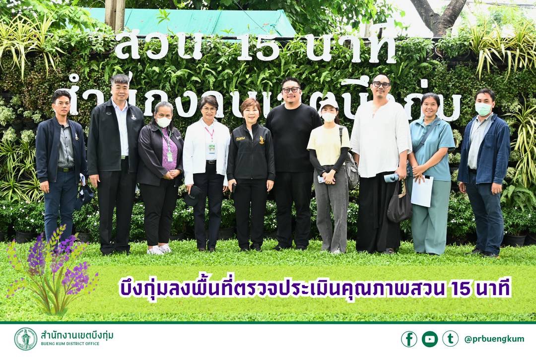 51552025-05-30 00:00:00.00000000.000.00(วันอังคารที่ 27 พฤษภาคม 2568) นางสาวเบญจพร ศักดิ์เรืองแมน ผู้อำนวยการเขตบึงกุ่ม พร้อมด้วยนายอภิชัญ พันธ์นิธิทร์ นางสาวมนพัทธ์ เสนาพล ผู้ช่วยผู้อำนวยการเขต และเจ้าหน้าที่ฝ่ายรักษาความสะอาดและสวนสาธารณะ ร่วมกับสำนักสิ่งแวดล้อม และคณะทำงานขับเคลื่อนนโยบายสวน 15 นาที ประจำกลุ่มเขตกรุงเทพตะวันออก ลงพื้นที่ตรวจประเมินคุณภาพสวน 15 นาที ของสำนักงานเขตบึงกุ่มทั้ง 7 แห่ง ได้แก่ ???? สวน 15 นาทีสำนักงานเขตบึงกุ่ม ???? สวน 15 นาที ศูนย์การเรียนรู้การจัดการมูลฝอยและสิ่งแวดล้อม ???? อุทยานบัวบึงกุ่ม ???? สวน 15 นาที หมู่บ้านเสริมมิตร ซอยนวมินทร์ 68 แยก 8-5-1 ???? โรงเรียนวัดนวลจันทร์ ???? ซอยนวมินทร์ 53 (นิตยาไก่ย่าง) ???? หมู่บ้านนาริสา – ทวีสุข ซอยเสรีไทย 29 โดยทางคณะทำงานฯ ได้ให้คำปรึกษาเรื่องการออกแบบพัฒนาสวน พร้อมเสนอแนะแนวทางในการพัฒนาพื้นที่สีเขียวและสวน 15 นาทีของสำนักงานเขตบึงกุ่ม เพื่อให้ได้มาตรฐาน และผ่านเกณฑ์ประเมินคุณภาพตามตัวชี้วัด