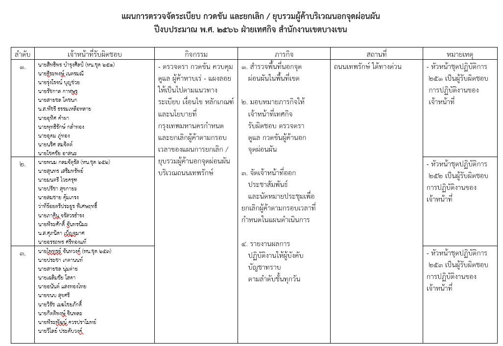 | 7 | ![]() | 2023-10-25 00:00:00.0000000 | 0.00 | 0.00 | สำรวจพื้นที่ทำการค้านอกจุดผ่อนผัน บริเวณถนนเทพรักษ์ เพื่อยกเลิกหรือยุบรวม |