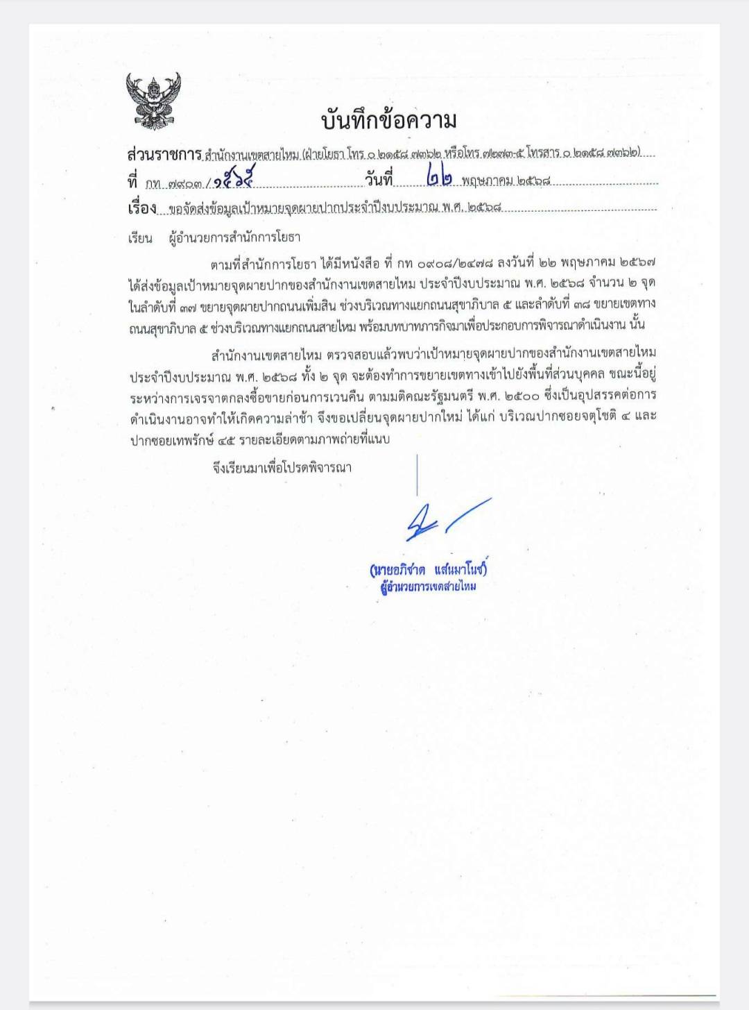 50192025-08-25 00:00:00.00000002.000.00สำนักงานเขตสายไหม ดำเนินการผายปากทาง จำนวน 2 จุด 1. ปากซอยจตุโชติ 4 2. ปากซอยเทพรักษ์ 45 ปัจจุบันดำเนินการแล้วเสร็จแล้ว จำนวน 2 จุด