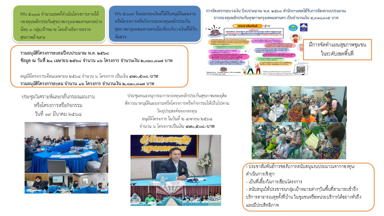 | 5232 | ![]() | 2025-08-25 00:00:00.0000000 | 0.00 | 0.00 | รายงานผลการดำเนินงานกองทุนหลักประกันสุขภาพเขตดุสิต ประจำปีงบประมาณ 2568 1. การจัดประชุมคณะอนุกรรมการกองทุนหลักประกันสุขภาพเขตดุสิต จำนวน 10 ครั้ง มีโครงการที่ผ่านการอนุมัติแล้วมีจำนวน 37 โครงการ เป็นเงิน 5,687,690 บาทคิดเป็นร้อยละ 96.09 2. มีการจัดทำแผนสุขภาพชุมชนในระดับเขตพื้นที่ 3. จัดการประชุมวิเคราะห์แผนงานและกลั่นกรองแผนงานหรือโครงการหรือกิจกรรม 4. สนับสนุนให้ประชาชนกลุ่มเป้าหมายต่างๆในพื้นที่สามารถเข้าถึงบริการสาธารณสุขทั้งที่บ้าน ในชุมชนหรือหน่วยบริการได้อย่างทั่วถึงและมีประสิทธิภาพ 5. เป็นพี่เลี้ยงในการเขียนโครงการให้กับผู้ที่สนใจเขียนโครงการในพื้นที่ 6. ประชาสัมพันธ์การขอรับการสนับสนุนงบประมาณจากกองทุน/ดำเนินการเชิงรุก 7. กำกับติดตามการดำเนินงานโครงการในระดับเขตพื้นที่ | ||