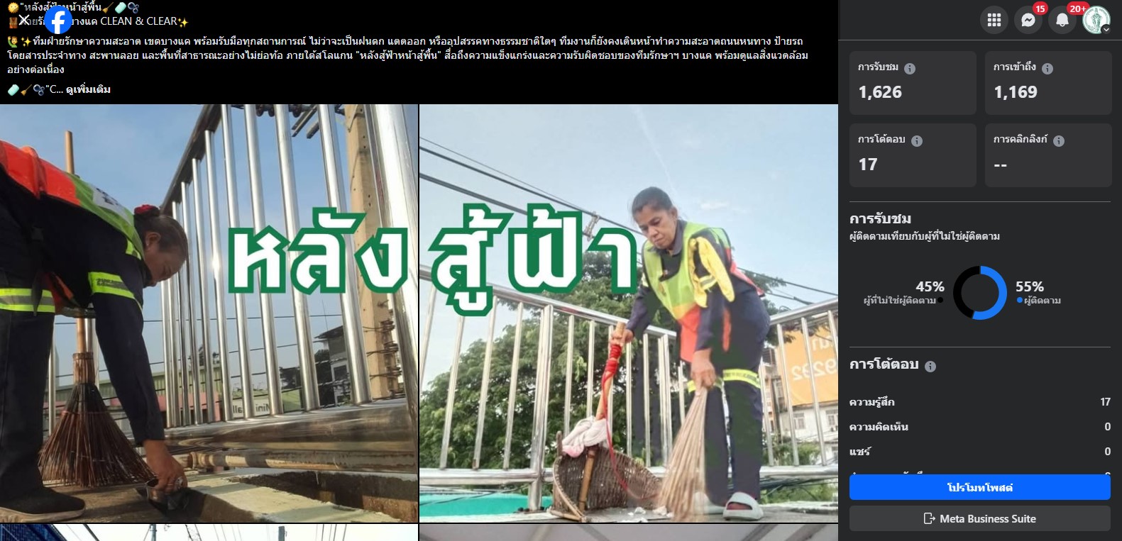 | 5472 |  | 2024-12-11 00:00:00.0000000 | 933.00 | 0.00 | _241204_11.jpg) | จำนวนการมีส่วนร่วมกับสื่อประชาสัมพันธ์ เรื่อง บางแค ลงพื้นที่ ตรวจสอบเหตุคอสะพานชำรุด ณ สะพานข้ามคลองบางแวก ถนนหมู่บ้านเศรษฐกิจ ที่เผยแพร่ (Engagement) TIKTOK บางแคแคร์ทุกคน เมื่อวันที่ 20 พฤศจิกายน 2567 = 933 | |