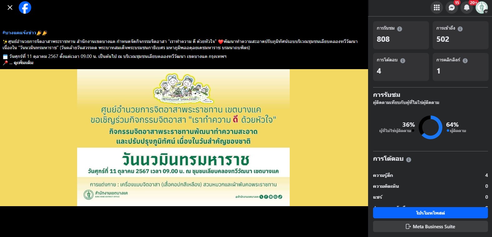 | 5472 |  | 2024-12-11 00:00:00.0000000 | 740.00 | 0.00 | _241204_14.jpg) | จำนวนการมีส่วนร่วมกับสื่อประชาสัมพันธ์ เรื่อง “ตลาดนัด กระตุ้นเศรษฐกิจ กลุ่มเขตกรุงธนใต้ " ที่เผยแพร่ (Engagement) TIKTOK บางแคแคร์ทุกคน เมื่อวันที่ 27 ตุลาคม 2567 = 740 | |