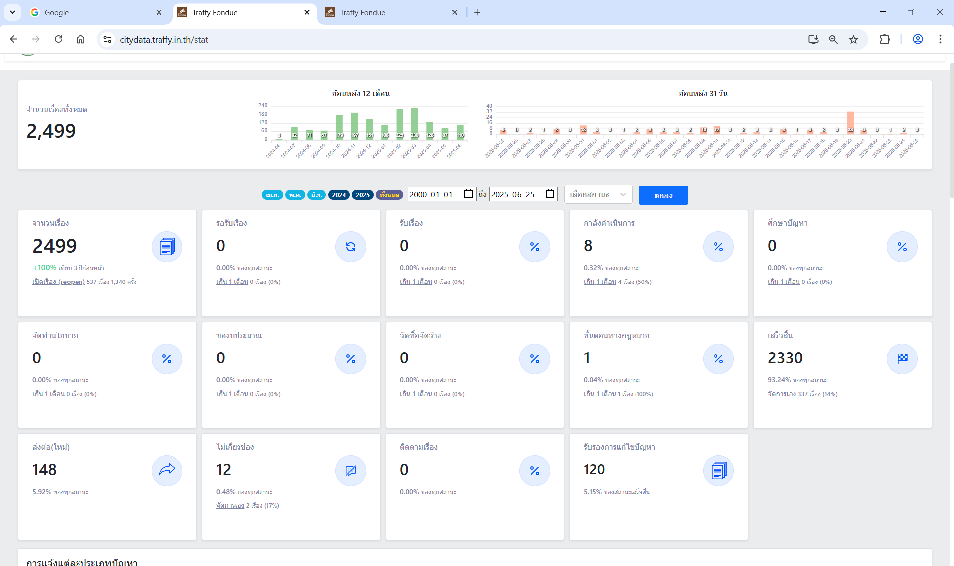 51302025-06-25 00:00:00.000000099.610.00สัดส่วนเรื่องที่ดำเนินการเสร็จสิ้นต่อเรื่องทั้งหมด ณ วันที่ 25 มิถุนายน 2568 จำนวน 2,330 เรื่อง จากเรื่องร้องเรียนที่อยู่ในอำนาจหน้าที่ของสำนักเทศกิจ จำนวน 2,339 เรื่อง คิดเป็นร้อยละ 99.61 รายละเอียดที่นำมาคำนวณร้อยละความสำเร็จ ดังนี้ สำนักเทศกิจมีการรับเรื่องผ่านแพลตฟอร์ม ตั้งแต่ระบบเริ่มรับเรื่อง - วันที่ 25 มิถุนายน 2568 สำนักเทศกิจมีเรื่องเข้าระบบ Traffy Fondue จำนวน 2,499 เรื่อง ส่งต่อหน่วยงานอื่นรับผิดชอบตามอำนาจหน้าที่ของหน่วยงาน จำนวน 148 เรื่อง ไม่เกี่ยวข้องจำนวน จำนวน 12 เรื่อง เป็นเรื่องที่อยู่ในอำนาจหน้าที่สำนักเทศกิจ จำนวน 2,339 เรื่อง สำนักเทศกิจดำเนินการเสร็จสิ้น จำนวน 2,330 เรื่อง อยู่ระหว่างดำเนินการ จำนวน 8 เรื่อง อยู่ในสถานะขั้นตอนทางกฎหมาย จำนวน 1 เรื่อง หมายเหตุ : ในการคำนวณผลมีการหักลบเรื่องที่ส่งต่อให้หน่วยงานอื่นและเรื่องที่ไม่เกี่ยวข้อง จำนวน 160 เรื่อง หากภาพผลการดำเนินงานไม่ปรากฎในระบบสามารถตรวจสอบได้ทาง https://drive.google.com/drive/folders/1B6ytXOav_sHKRCHFGBYX-RJabZC9LmiK โฟลเดอร์รวมภาพประกอบตัวชี้วัด TraffyFondue ประจำเดือน มิ.ย. 2568