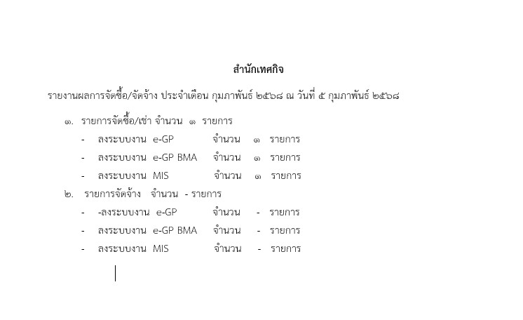 | 5134 | ![]() | 2025-03-05 00:00:00.0000000 | 0.00 | 0.00 | สำนักเทศกิจ รายงานผลการจัดซื้อ/จัดจ้าง ประจำเดือน มีนาคม 2568 ณ วันที่ 5 มีนาคม 2568 1. รายการจัดซื้อ/จัดจ้าง จำนวน 0 รายการ - ลงระบบงาน e-GP จำนวน 0 รายการ - ลงระบบงาน e-GP BMA จำนวน 0 รายการ - ลงระบบงาน MIS จำนวน 0 รายการ | ||