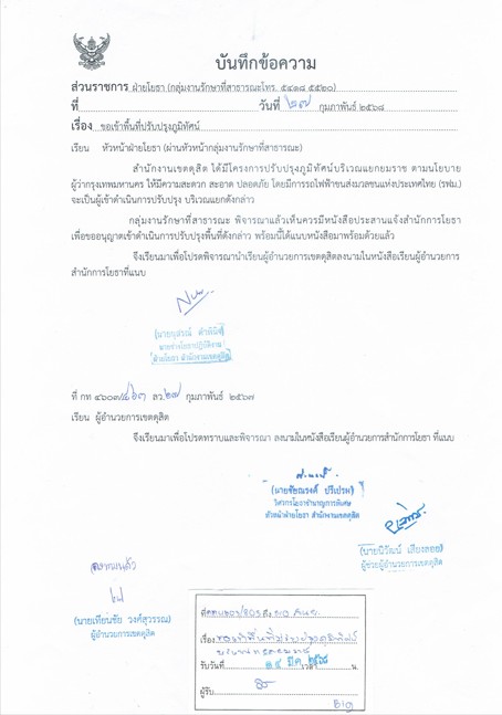 | 5213 | ![]() | 2025-03-17 00:00:00.0000000 | 0.00 | 0.00 | ข้อมูล ณ วันที่ 17 มีนาคม 2568 สำนักงานเขตดุสิตได้มีหนังสือถึงสำนักการโยธาเพื่อขอใช้พื้นที่ปรับปรุงภูมิทัศน์เมือง |
