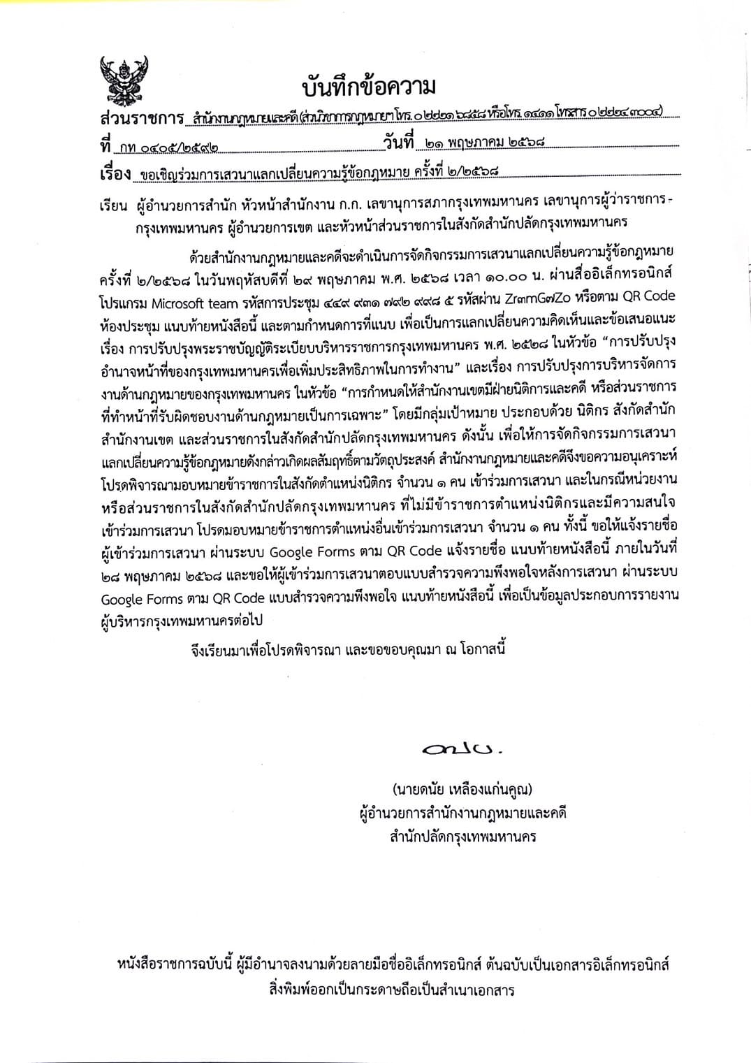 | 7221 | ![]() | 2025-06-19 00:00:00.0000000 | 0.00 | 0.00 | สกค. ได้ดำเนินการจัดการเสวนาแลกเปลี่ยนความรู้ข้อกฎหมาย ครั้งที่ 2 เมื่อวันที่ 5 มิถุนายน 2568 เวลา 10.00 น. ผ่านสื่ออิเล็กทรอนิกส์ โปรแกรม Microsoft team ซึ่งมีนิติกรและเจ้าหน้าที่ของหน่วยงานสังกัดกรุงเทพมหานครเข้าร่วม โดยมีหัวข้อการเสวนา ดังนี้ - เรื่อง การปรับปรุงพระราชบัญญัติระเบียบบริหารราชการกรุงเทพมหานคร พ.ศ. 2528 หัวข้อ "การปรับปรุงอำนาจหน้าที่ของกรุงเทพมหานครเพื่อเพิ่มประสิทธิภาพในการทำงาน" - เรื่อง การปรับปรุงการบริหารจัดการงานด้านกฎหมายของกรุงเทพมหานคร หัวข้อ " การกำหนดให้สำนักงานเขตมีฝ่ายนิติการและคดี หรือส่วนราชการที่ทำหน้าที่รับผิดชอบงานด้านกฎหมายเป็นการเฉพาะ" | ||