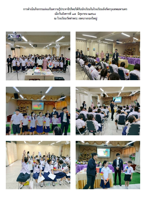| 5784 | ![]() | 2025-06-24 00:00:00.0000000 | 12.50 | 0.00 | ดำเนินกิจกรรมการส่งเสริมความรู้ประชาธิปไตยให้กับนักเรียนในโรงเรียนสังกัดกรุงเทพมหานคร เมื่อวันอังคารที่ 17 มิถุนายน 2568 ณ โรงเรียนท่าพระ เขตบางกอกใหญ่ มีนักเรียนระดับประถมศึกษาเข้าร่วมกิจกรรม จำนวน 50 คน ทั้งนี้ จำนวนนักเรียนที่เข้ารับการอบรมรวมทั้งสิ้นเป็นร้อยละ 75 ของนักเรียนที่เข้ารับการอบรมทั้งหมด | ||