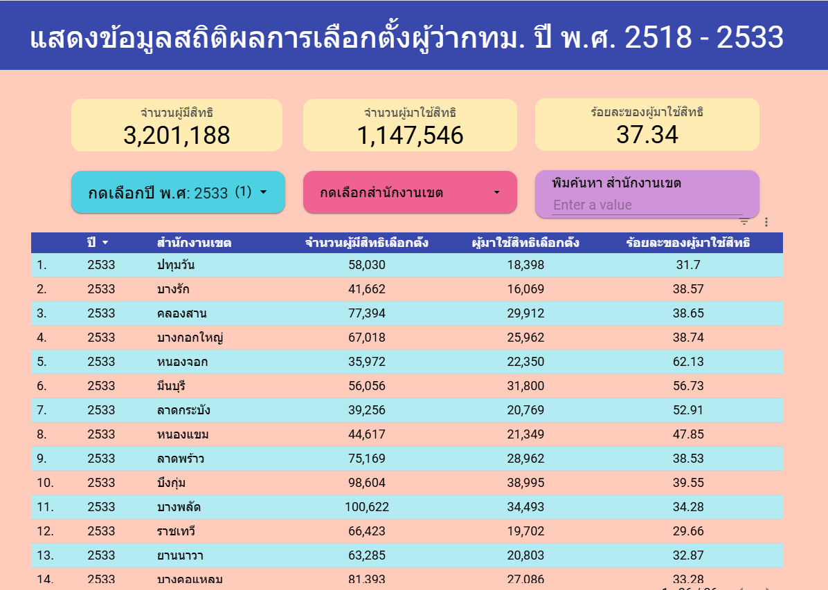 | 5777 | ![]() | 2025-01-23 00:00:00.0000000 | 0.00 | 0.00 | อยู่ระหว่าง การนำข้อมูลเกี่ยวกับการเลือกตั้งสมาชิกสภากรุงเทพมหานครและผู้ว่าราชการกรุงเทพมหานคร (รูปแบบไฟล์เอกสาร Microsoft word หรือ PDF ในปีที่มีการเลือกตั้ง ตั้งแต่อดีตจนถึงปัจจุบันเข้าสู่ระบบโปรแกรม Microsoft Excel ) | ||