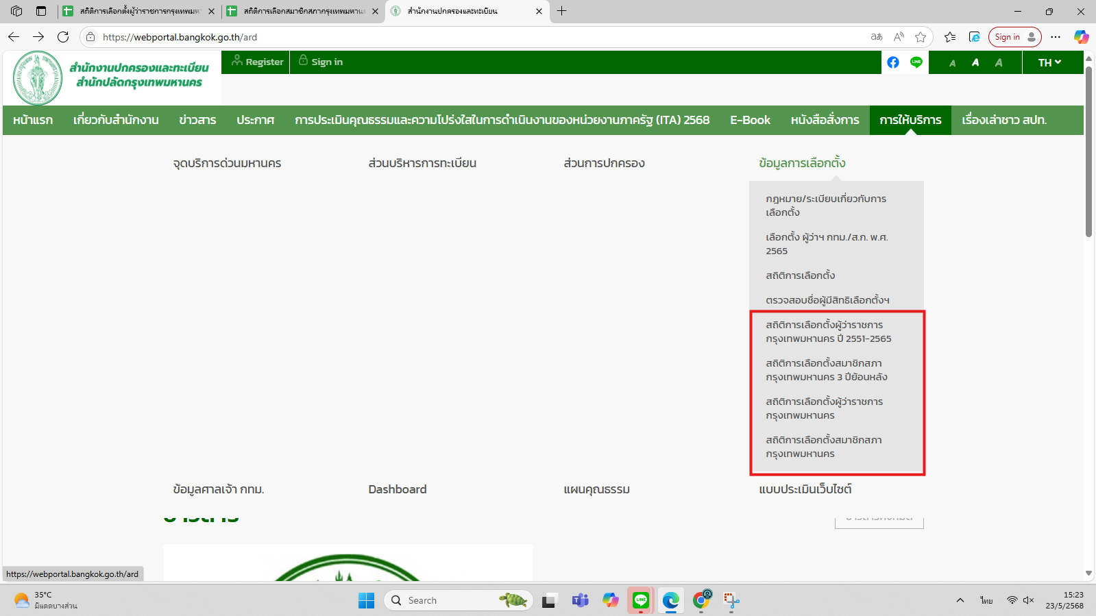 | 5777 | ![]() | 2025-05-23 00:00:00.0000000 | 1.00 | 0.00 | เผยแพร่ข้อมูลเกี่ยวกับการเลือกตั้งผู้บริหารท้องถิ่น และสมาชิกสภาท้องถิ่นกรุงเทพมหานคร ในรูปแบบอิเล็กทรอนิกส์ ลงบนเว็บไซต์สำนักงานปกครองเเละทะเบียน https://webportal.bangkok.go.th/ard | ||