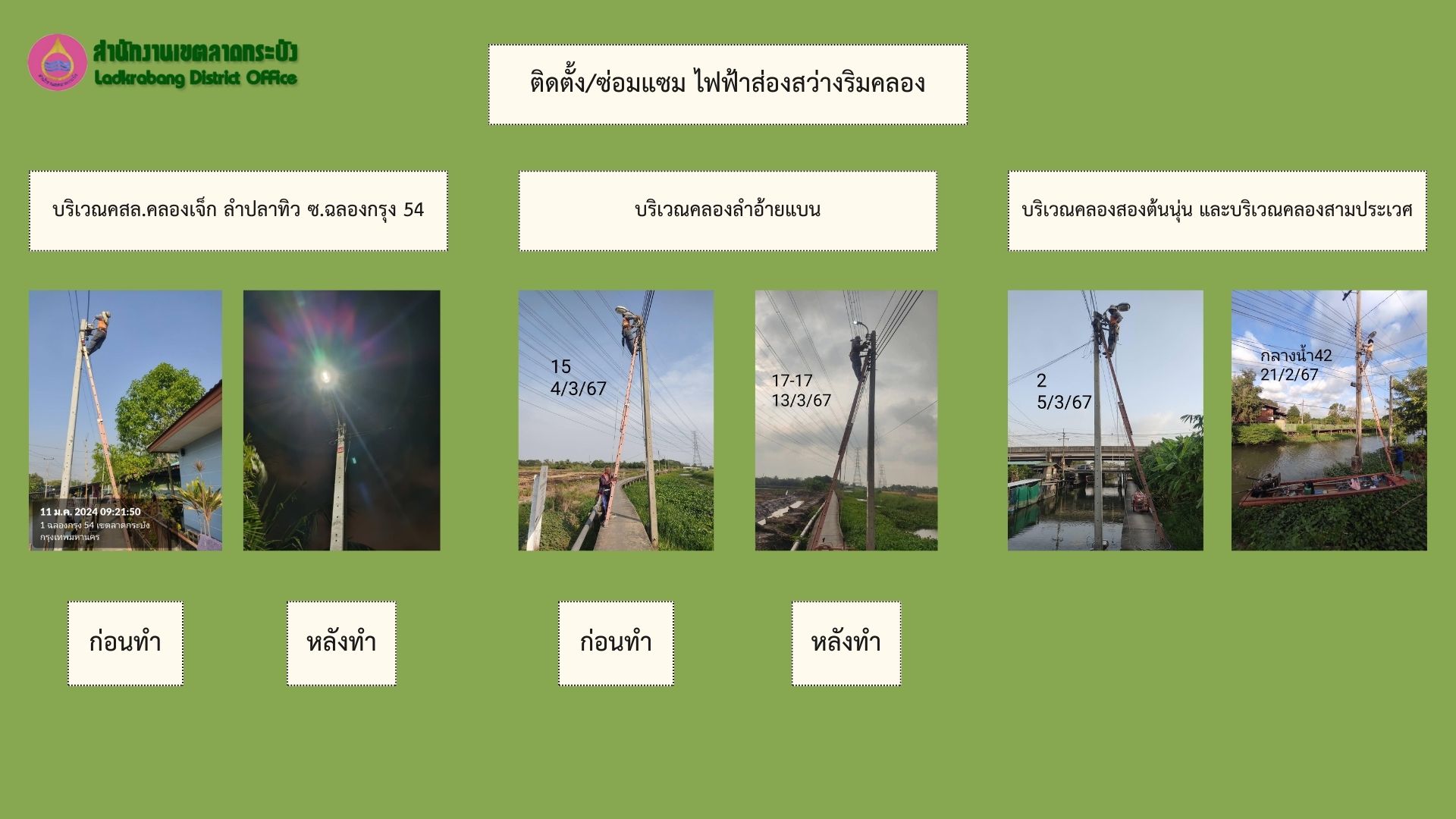 62024-01-16 00:00:00.00000000.000.00สำนักงานเขตลาดกระบัง โดยฝ่ายโยธา เข้าติดตั้งหลอดไฟ LED ที่ คสล.คลองเจ็ก ลำปลาทิว ซ.ฉลองกรุง 54