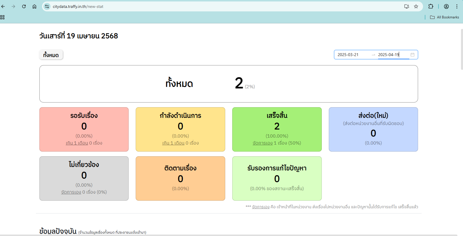 | 5129 |  | 2025-07-23 00:00:00.0000000 | 0.00 | 0.00 |  | ร้อยละของเรื่องทั้งหมดที่แจ้งผ่าน Traffy Fondue ได้รับการแก้ไข ประจำเดือนกรกฎาคม 2568 (ระหว่างวันที่ 21 มิ.ย. - 23 ก.ค. 2568) เสร็จสิ้น จำนวน 1 เรื่อง คิดเป็น 100.00% | |