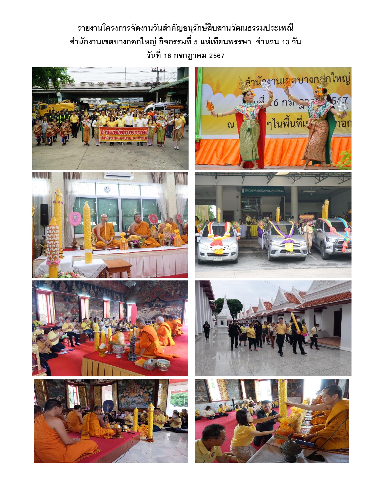 | 503 | ![]() | 2024-07-23 00:00:00.0000000 | 5.00 | 0.00 | เดือนก.ค. 67 สำนักงานเขตบางกอกใหญ่ โดยฝ่ายพัฒนาชุมชนฯ จัดกิจกรรมแห่เทียนพรรษา วัดในพื้นที่เขต จำนวน 13 วัด มีผู้ร่วมกิจกรรมจากหน่วยงานราชการภายนอก เช่น ทหารเรือ ตำรวจ วิทยาลัยเทคโนโลยีสยาม ชุมชน โรงเรียนภายในพื้นที่เขต และสถานประกอบการในพื้นที่เขตเข้าร่วมกิจกรรม ในวันที่ 16 ก.ค. 67 | ||