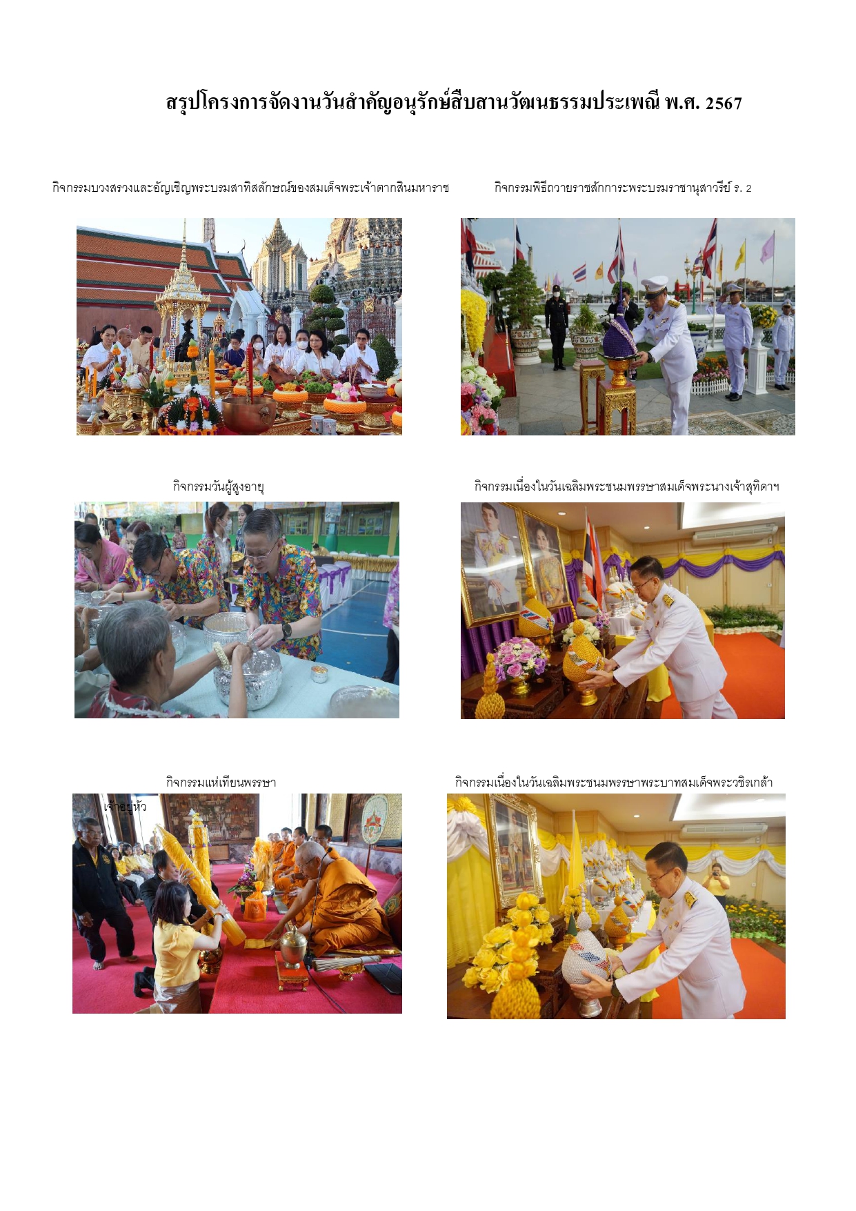 | 503 | ![]() | 2024-08-27 00:00:00.0000000 | 0.00 | 0.00 | โครงการจัดงานวันสำคัญอนุรักษ์สืบสานวัฒนธรรมประเพณี ประจำปีงบประมาณ พ.ศ. 2567 ได้ดำเนินการครบทั้ง 6 กิจกรรมเรียบร้อยแล้วและได้ทอดแบบสอบถามความพึงพอใจ กิจกรรมละ 200 คน ผลสรุปความพึงพอใจในกิจกรรมบวงสรวงและอัญเชิญพระบรมสาทิสลักษณ์สมเด็จพระเจ้าตากสินมหาราช ได้ร้อยละ 98.37 และ ผลสรุปความพึงพอใจในกิจกรรมพิธีถวายราชสักการะพระบรมราชานุสาวรีย์พระบาทสมเด็จพระพุทธเลิศหล้านภาลัย ได้ร้อยละ 89.69 | ||