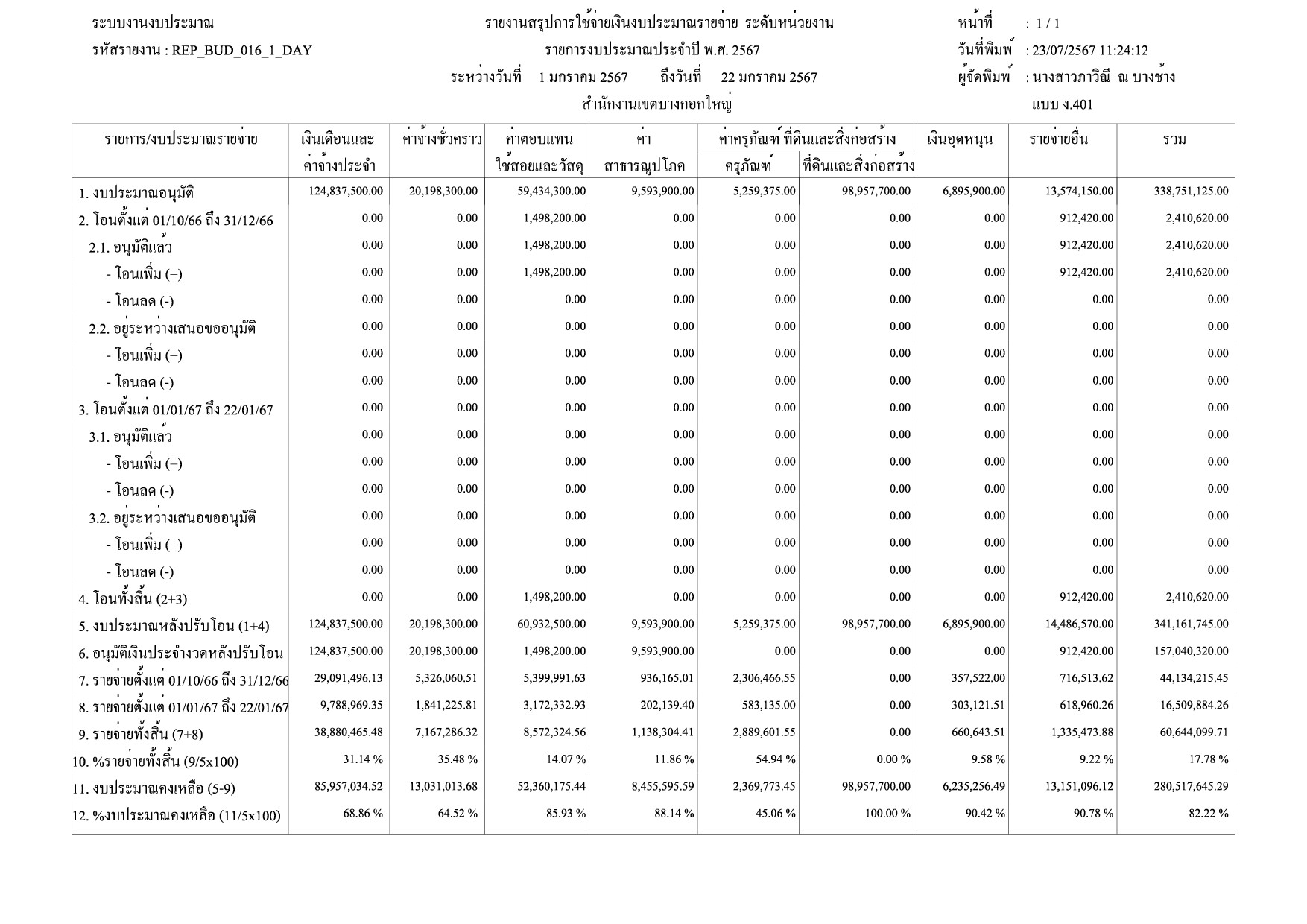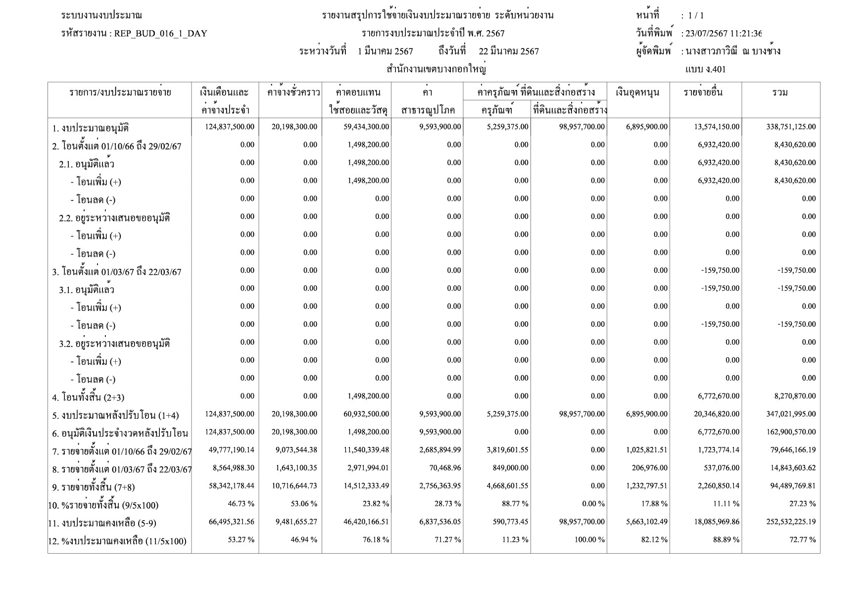 | 1415 | ![]() | 2024-03-22 00:00:00.0000000 | 2.40 | 0.00 | ดำเนินการเบิกจ่ายงบประมาณรายจ่ายประจำปี 2567 รวม 5 หมวดรายจ่าย ได้แก่ หมวดค่าตอบแทน ใช้สอยและวัสดุ หมวดค่าสาธารณูปโภค หมวดค่าครุภัณฑ์ ที่ดินและสิ่งก่อสร้าง หมวดเงินอุดหนุน และหมวดรายจ่ายอื่น ณ วันที่ 22 มีนาคม 2567 จำนวน 25,374,552.30 คิดเป็นร้อยละ 12.56% | ||