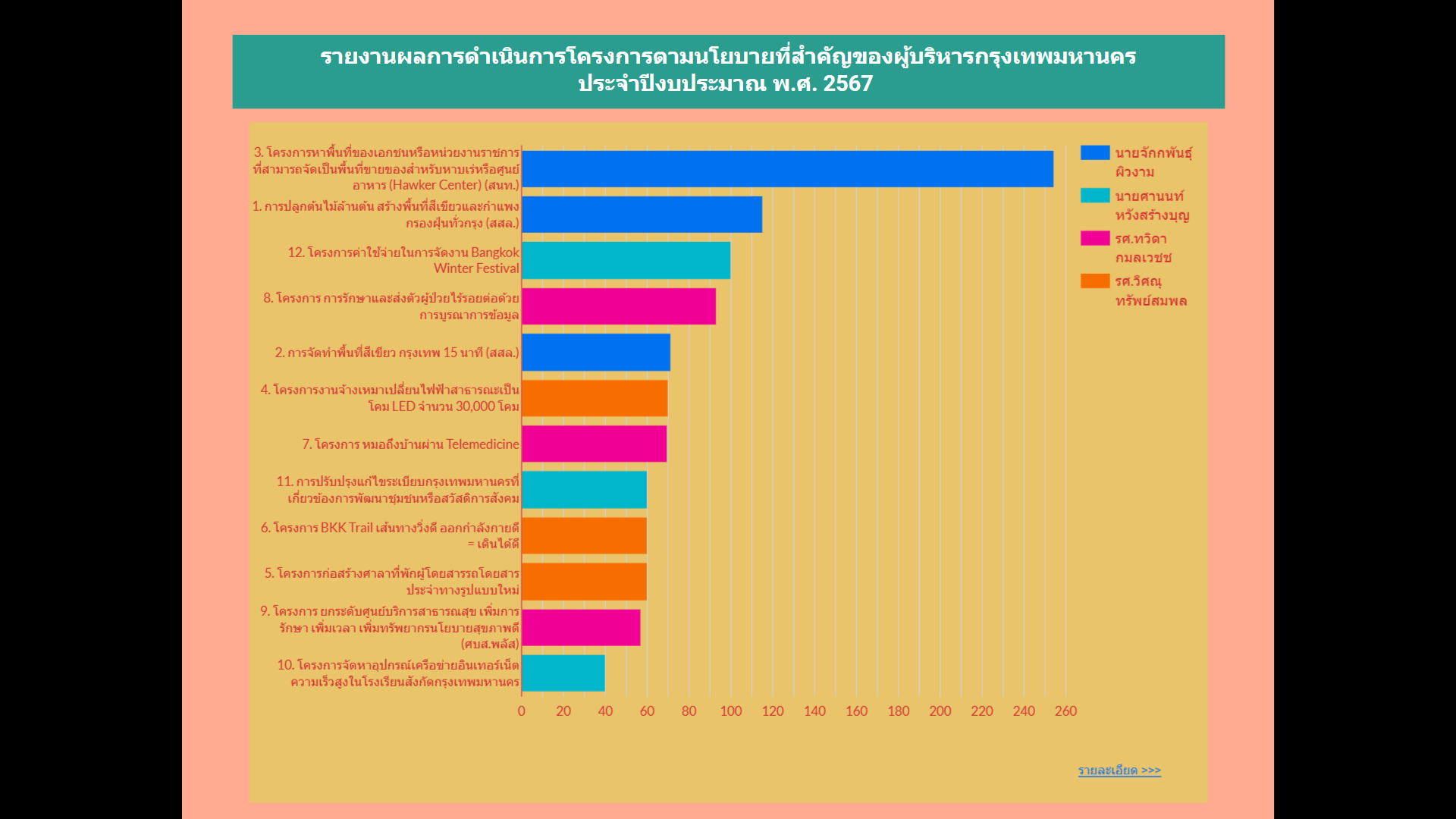 รายละเอียดโครงการ : กิจกรรมติดตามความสำเร็จในการบริหารจัดการโครงการ ทั้ง 12 โครงการสำคัญของรองผู้ว่าราชการกรุงเทพมหานครให้เป็นไปตามเป้าหมายที่กำหนด (ID: 2299)