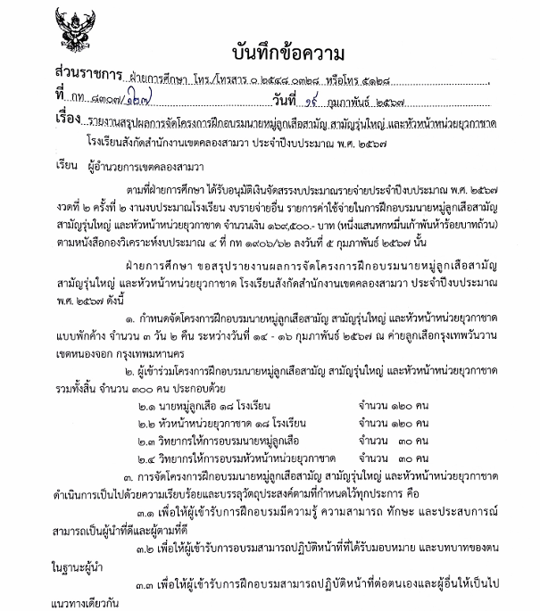 โครงการการฝึกอบรมนายหมู่ลูกเสือสามัญ สามัญรุ่นใหญ่ และหัวหน้าหน่วยยุวกาชาด169,500.00100.00สำนักงานเขตคลองสามวาฝ่ายการศึกษา