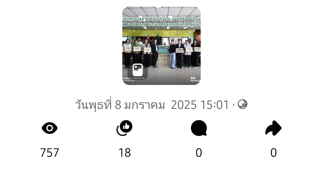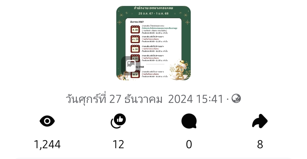| 5472 |  | 2025-01-23 00:00:00.0000000 | 1,328.00 | 0.00 |  | จำนวนการมีส่วนร่วมกับสื่อประชาสัมพันธ์ที่เผยแพร่(Engagement) ผ่านช่องทาง Facebook สำนักงานเขตบางคอแหลม เมื่อวันที่ 23 มกราคม 2568 = 1328 | |