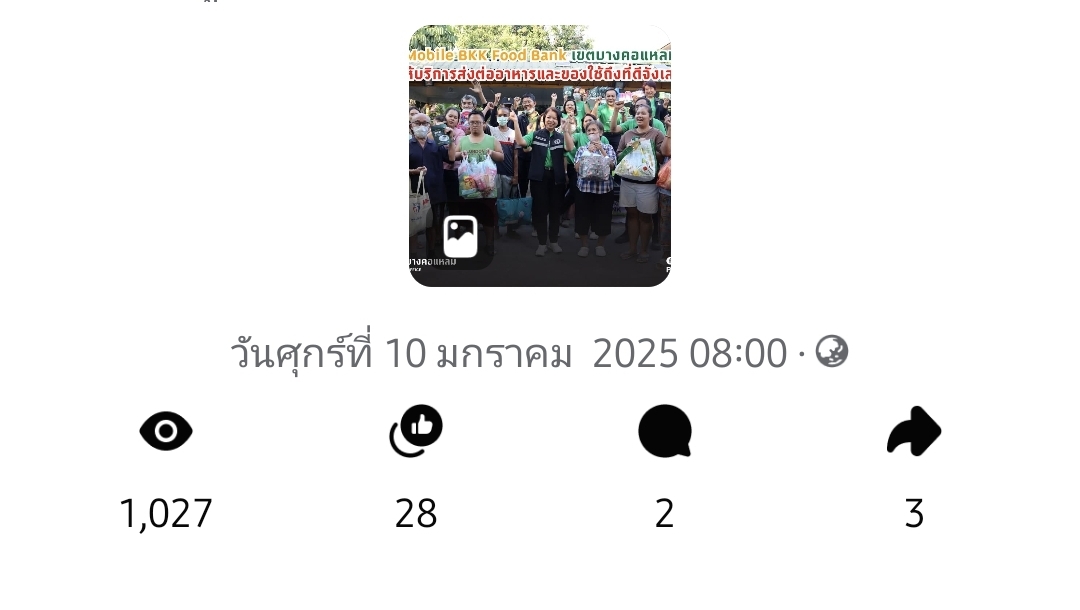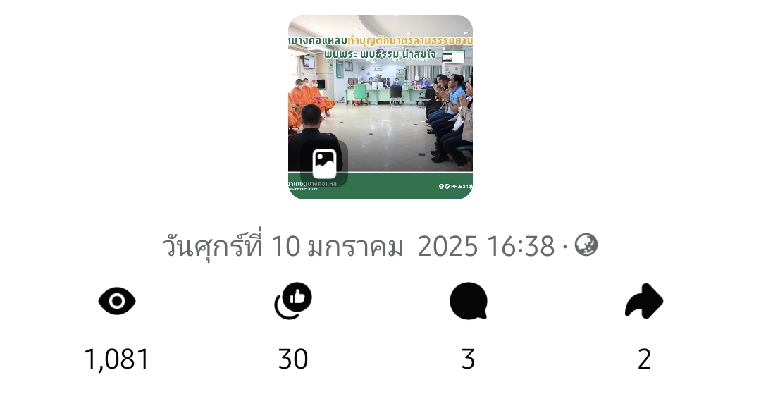 | 5472 |  | 2025-01-23 00:00:00.0000000 | 1,122.00 | 0.00 |  | จำนวนการมีส่วนร่วมกับสื่อประชาสัมพันธ์ที่เผยแพร่(Engagement) ผ่านช่องทาง Facebook สำนักงานเขตบางคอแหลม เมื่อวันที่ 23 มกราคม 2568 = 1122 | |