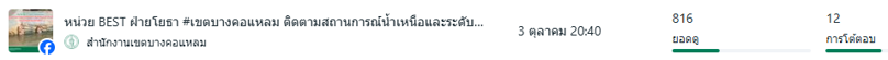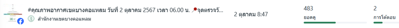 | 5472 |  | 2024-12-09 00:00:00.0000000 | 1,601.00 | 0.00 |  | จำนวนการมีส่วนร่วมกับสื่อประชาสัมพันธ์ที่เผยแพร่(Engagement) ผ่านช่องทาง Facebook สำนักงานเขตบางคอแหลม เมื่อวันที่ 9 ธันวาคม 2567 = 1,601 | |