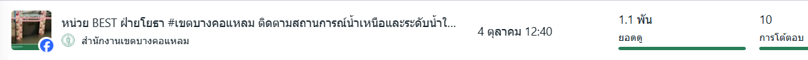 | 5472 |  | 2024-12-09 00:00:00.0000000 | 1,672.00 | 0.00 |  | จำนวนการมีส่วนร่วมกับสื่อประชาสัมพันธ์ที่เผยแพร่(Engagement) ผ่านช่องทาง Facebook สำนักงานเขตบางคอแหลม เมื่อวันที่ 9 ธันวาคม 2567 = 1,672 | |