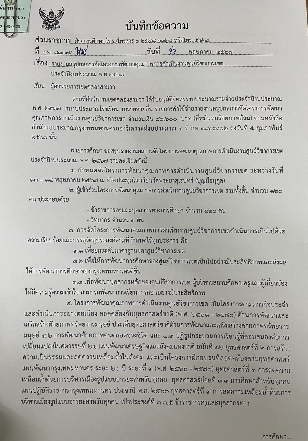 โครงการการพัฒนาคุณภาพการดำเนินงานศูนย์วิชาการเขต40,600.00100.00สำนักงานเขตคลองสามวาฝ่ายการศึกษา