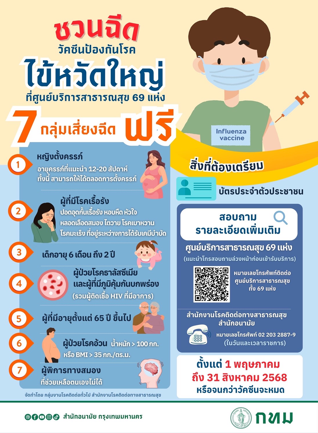 | 99 |  | 2025-05-01 00:00:00.0000000 | 0.00 | 0.00 |  | มีการจัดประชุมชี้แจงแนวทางการดำเนินงานวัคซีนป้องกันโรคไข้หวัดใหญ่ในประชาชนกลุ่มเสี่ยงและบุคลากรทางการแพทย์เมื่อวันที่ 25 เม.ย.68 และมีการประชาสัมพันธ์ชวนฉีดวัคซีนป้องกันโรคไข้หวัดใหญ่ ผ่านสำนักอนามัยและศูนย์บริการสาธารณสุขอย่างต่อเนื่อง ในส่วนของการรับบริการวัคซีนป้องกันโรคไข้หวัดใหญ่ของประชาชน 7 กลุ่มเสี่ยง เป็นไปตามแผนงานที่กำหนดโดยศูนย์บริการสาธารณสุขทุกแห่งเริ่มให้บริการตั้งแต่วันที่ 1 พ.ค.68 เป็นต้นไปจนกว่าวัคซีนจะหมด | |